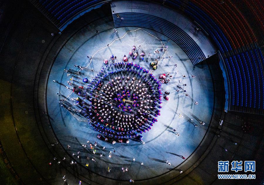 演員在苗族大型山水實(shí)景演出《西江盛典》中表演(7月30日攝,無(wú)人機(jī)照片)。新華社記者陶亮攝