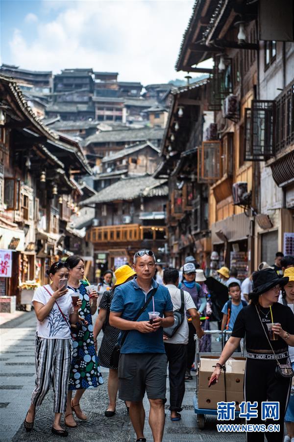 游客在貴州省雷山縣西江千戶苗寨景區(qū)內游玩(7月31日攝)。新華社記者陶亮攝