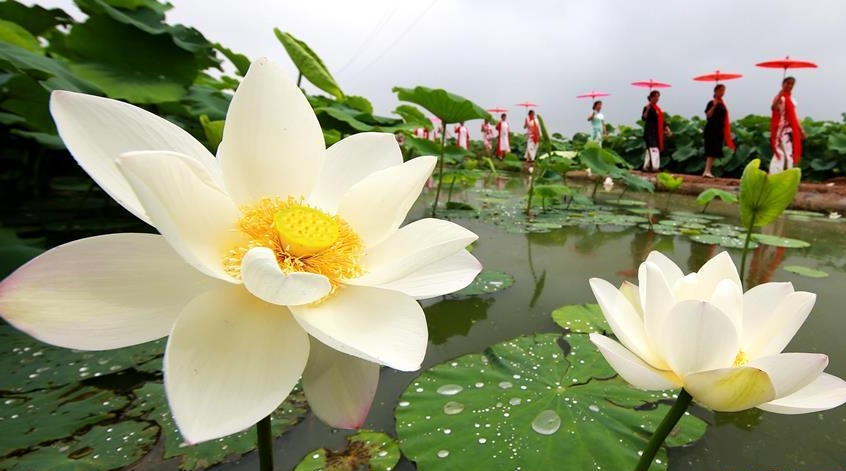 7月3日,游客在曲周縣勝豐蓮藕種植專業(yè)合作社荷塘景區(qū)寫生。