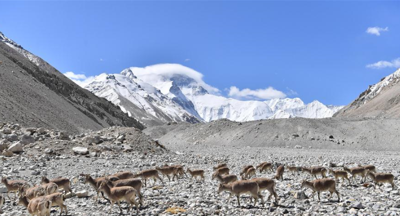 5月8日,一群巖羊在珠峰大本營周圍覓食,黃嘴山鴉飛到巖羊身上停留,構(gòu)成一幅幅生動有趣的雪域圖畫。