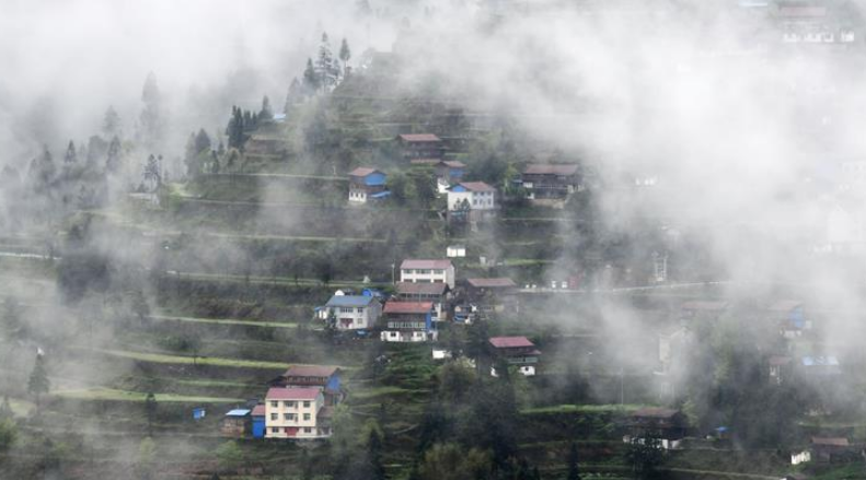 當(dāng)日,在貴州省黔東南苗族侗族自治州,一場春雨過后,村莊、山川、田野在薄霧中若隱若現(xiàn),美若畫卷。