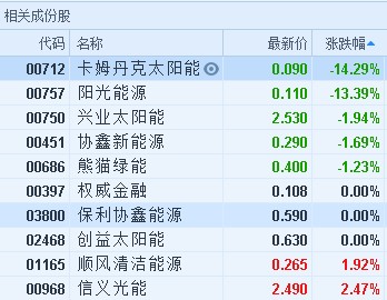 多只炒高的光伏股今日顯著回吐,截至11時(shí)53分,卡姆丹克太陽能(00712)跌14.29%,報(bào)價(jià)0.09港元,陽光能源(00757)跌13.39%,報(bào)0.11港元。