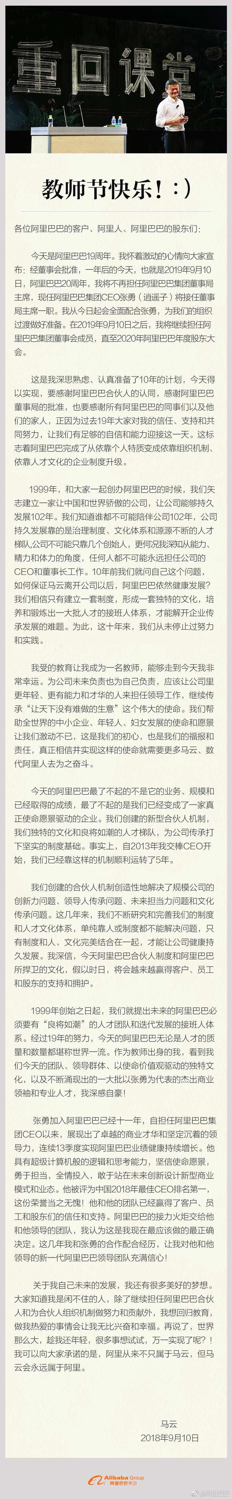 阿里巴巴官方微博和微信公眾號均發(fā)布了一封馬云的公開信,信中表示,一年后的阿里巴巴20周年之際,即2019年9月10日,他將不再擔任集團董事局主席,屆時由現(xiàn)任集團CEO張勇接任。