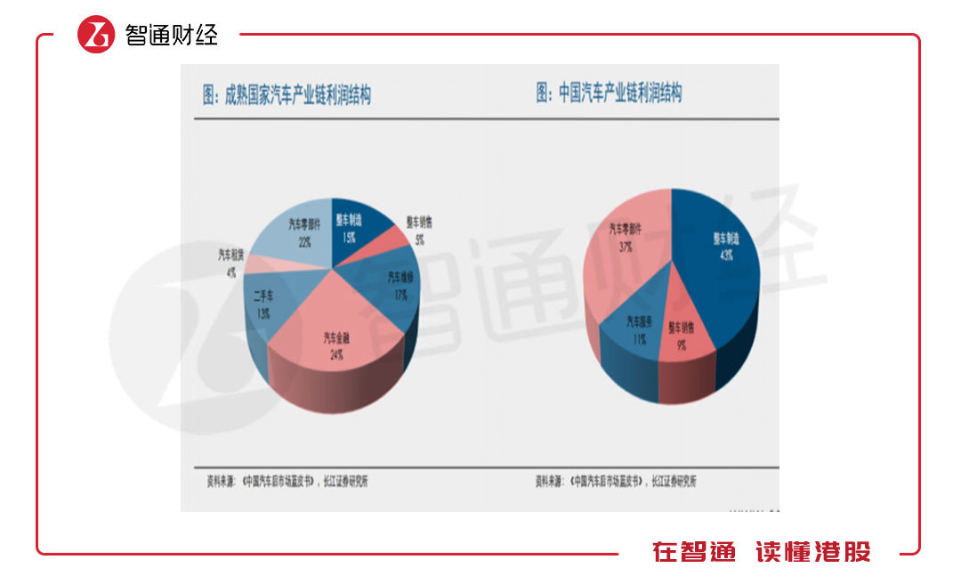 在港股上市公司中,汽車經(jīng)銷商主要銷售的均為進(jìn)口豪華車型,比如奧迪、奔馳及寶馬車型,主要還是國內(nèi)的自主品牌制造商有自己專門的銷售渠道。整體來看,銷售環(huán)節(jié)利潤率一般都不高,凈利率賺個售價的3-5個百分點左右。汽車后市場龐大,但目前市場較為零散,還未形成較大規(guī)模的企業(yè)。