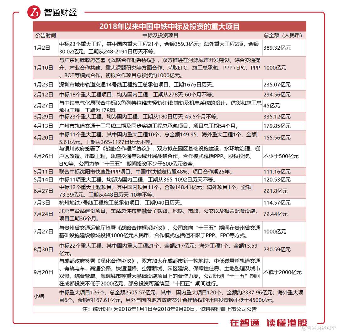 今年年初至9月底,中國(guó)中鐵共披露中標(biāo)的重大項(xiàng)目126個(gè),項(xiàng)目總金額2505.57億元,超過(guò)去年全年所披露的重大項(xiàng)目金額。而這是在海外重大項(xiàng)目數(shù)量及金額明顯減少的情況下取得的,反映國(guó)內(nèi)的基建需求依然強(qiáng)勁。這些中標(biāo)的重大項(xiàng)目對(duì)中國(guó)中鐵來(lái)說(shuō)也意味著未來(lái)可能釋放的巨大收入增長(zhǎng)空間。