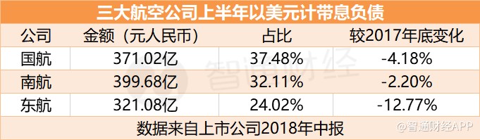 智通財經APP了解到,2015年高峰時,三大航空公司美元負債水平普遍在80%左右。2018年中期財報顯示,截止2018年6月30日,國航以美元計的帶息負債占帶息負債總額比重已經降至37.48%,南航、東航的美元帶息負債占比也分別降至32.11%、24.02%。絕對金額方面,目前以人民幣計美元有息負債規(guī)模,國航為371.02億、南航399.68億、東航321.08億。