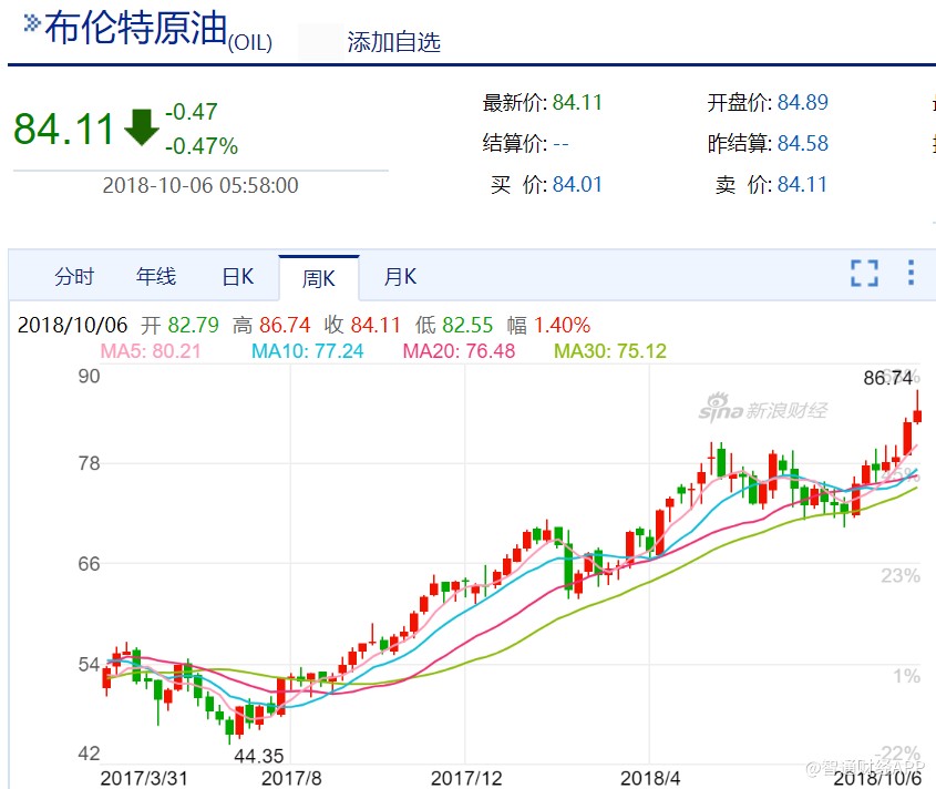 油價漲勢仍在持續(xù)。10月3日,布倫特原油盤中突破85美元/桶關口,創(chuàng)下近四年新高,這已是布倫特油價連續(xù)第5個季度上漲,是2007年初以來最長的一個上漲周期。