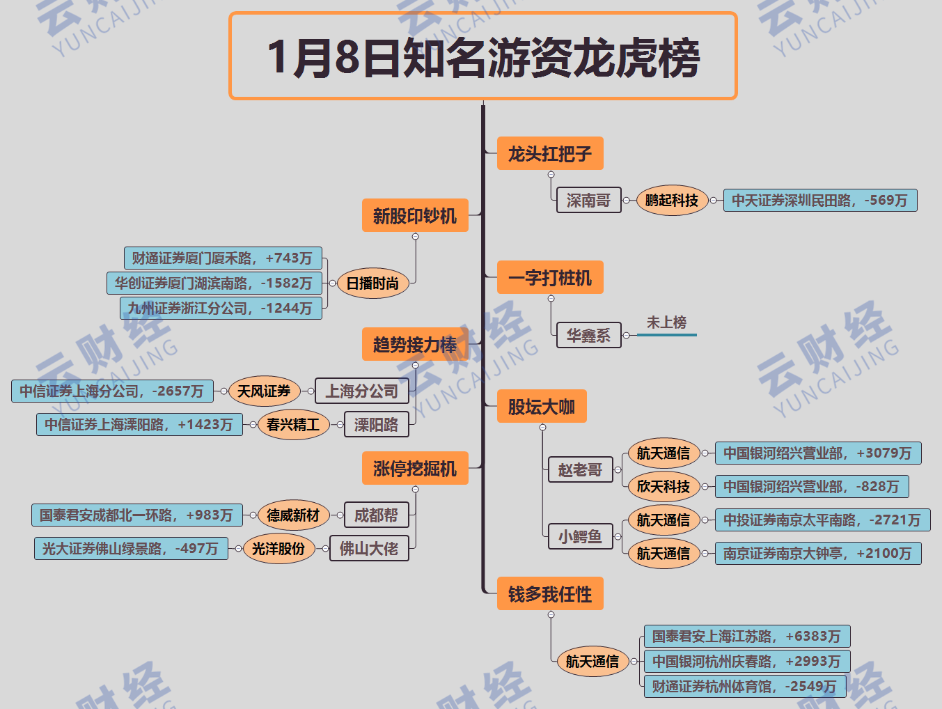其他游資方面,中信上海分公司割肉賣出天風證券(601162)2657萬,成都幫買入德威新材(300325)983萬,佛山幫賣出光洋股份(002708)497萬,深南哥賣出鵬起科技(600614)569萬。