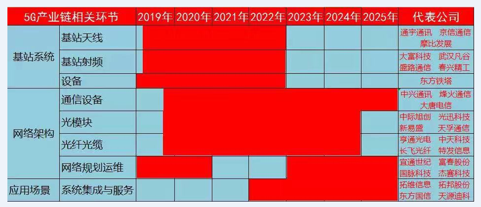 5G產(chǎn)業(yè)鏈受益周期及相關公司: