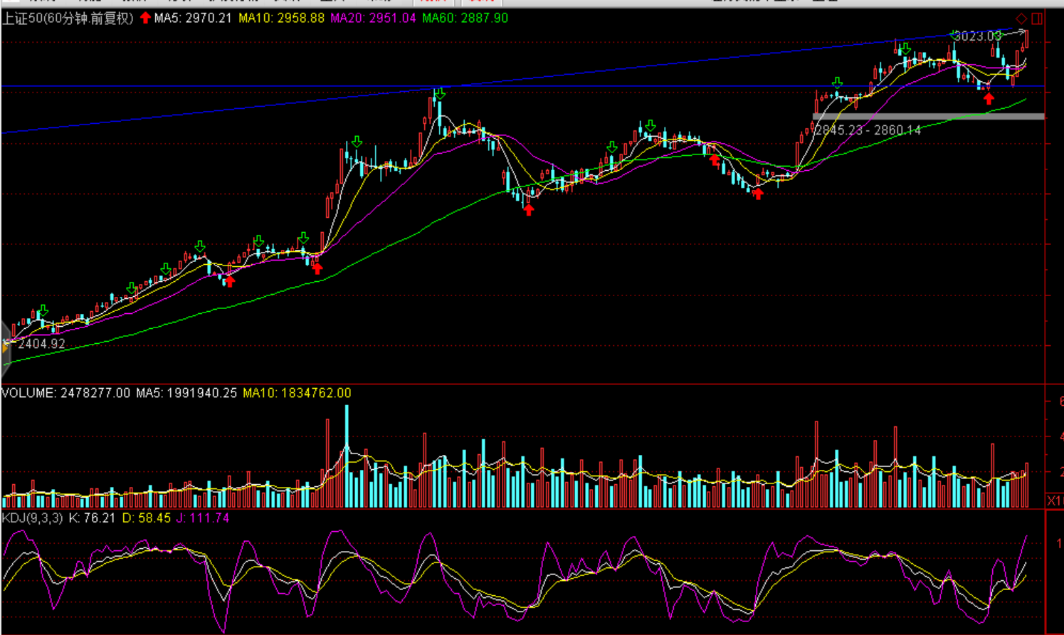 技術(shù)面:短期股強勁反彈修復調(diào)整結(jié)構(gòu),維持高位震蕩,60分鐘看上證50面臨壓力,預(yù)計今日股指沖高受阻,小陰或小陽報收。