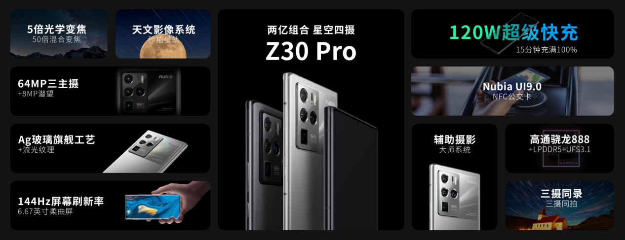 努比亞Z30 Pro將用戶(hù)需求與行業(yè)最前沿科技充分結(jié)合,打造無(wú)短板頂尖配置:搭載高通驍龍888+LPDDR5+UFS3.1頂尖性能鐵三角及行業(yè)最高的2億像素四攝組合全主攝影像系統(tǒng),獨(dú)占影像旗艦中最強(qiáng)的120W超級(jí)快充與144 Hz超高刷新率,并將全新升級(jí)的UI交互系統(tǒng)和更加強(qiáng)悍易用的影像功能融于一身,貫徹科技、藝術(shù)與用戶(hù)需求完美融合的平衡之道。全新一代努比亞Z系列旗艦——Z30 Pro攜星光而來(lái)。