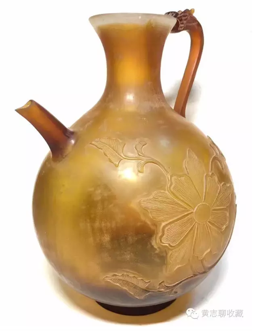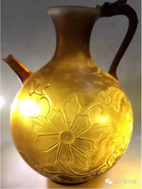 琉璃在唐代極為名貴。這從史書記載可窺一二。房玄齡的《晉書》中有關(guān)于琉璃器的記載“(王濟(jì))性豪侈,麗服玉食……帝嘗幸其宅,供饌甚豐,悉貯琉璃器中?!蓖鯘?jì)在招待皇帝時用了成套的琉璃碗盤,以逞其豪富,可見當(dāng)時琉璃器之貴重或要超過金、銀等器。又如宋代司馬光主編的《資治通鑒》中記載了這樣一段歷史事實:嶺南節(jié)度使路嗣恭在平息叛亂中趁機(jī)劫掠商民,得到了大批財物。他把其中一個直徑九寸的琉璃盤獻(xiàn)給了唐代宗。唐代宗非常高興,“以為至寶”。法門寺地宮出土的唐代琉璃器大多為皇家捐贈的禮佛之物也可佐證其珍貴。 這件執(zhí)壺為琉璃材質(zhì),高20cm、腹徑14.5cm,色澤黃褐,半透明,晶瑩潤澤,光澤柔和。小口,束頸,腹部圓鼓,餅足;前有直流,后為龍柄。整體形制穩(wěn)重大方,圓潤飽滿,具有典型的唐代特征。壺身兩面刻有菊紋,線條流暢自然,勁健有力。整體透入出唐人的灑脫自信。這類唐代的琉璃作品存世極少,目前為數(shù)不多的一些作品大多出自窖藏、地宮及貴族墓葬,屬于珍稀文物。此件執(zhí)壺保存完整,尤為難得。 欣賞更多藏品,歡迎瀏覽【黃志博物館】網(wǎng)站:www.huangzhimuseum.com?