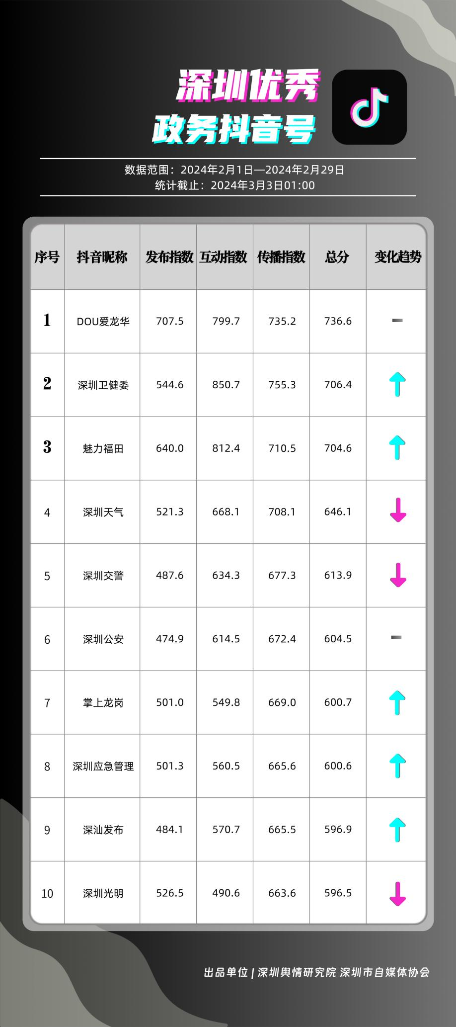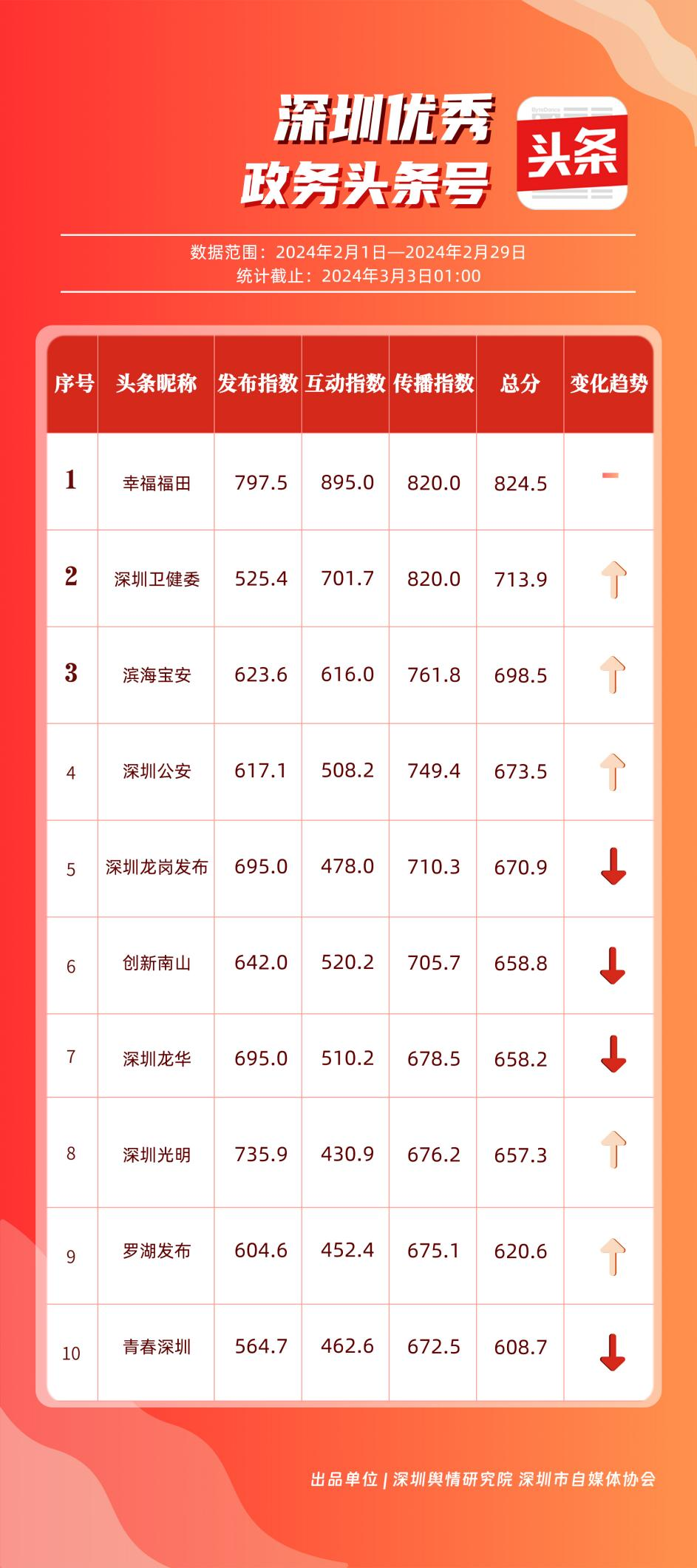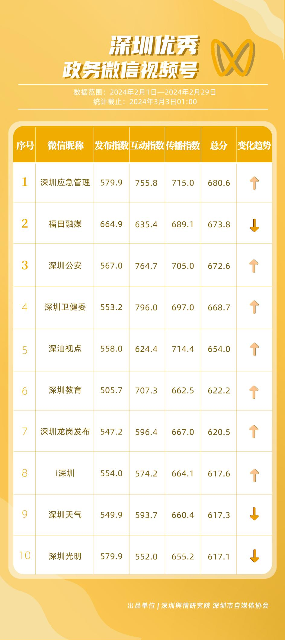 記者關(guān)注到,2月深圳優(yōu)秀政務(wù)新媒體矩陣共10個(gè),展現(xiàn)出多單位在鍛造政務(wù)新媒體優(yōu)質(zhì)矩陣方面取得的良好成效,助力深圳政務(wù)新媒體矩陣健康有序發(fā)展。