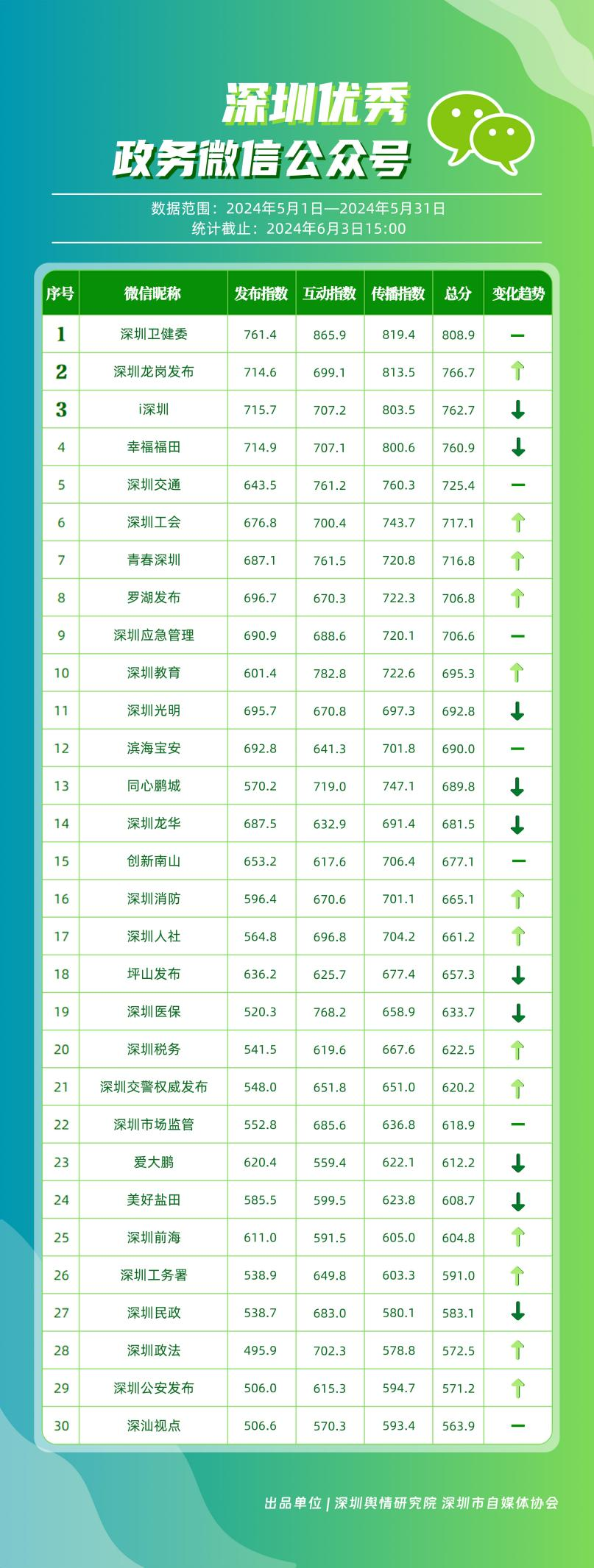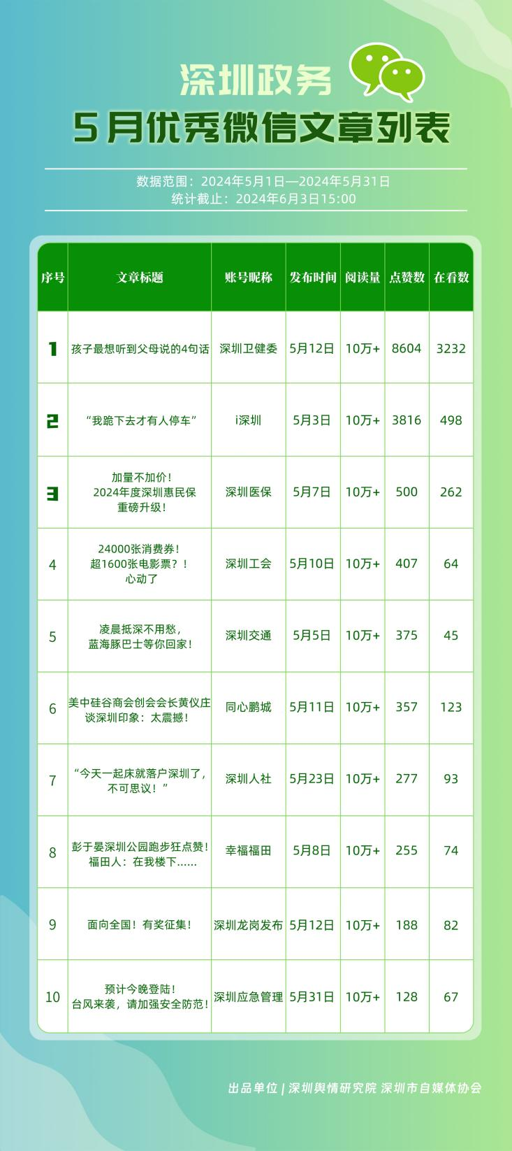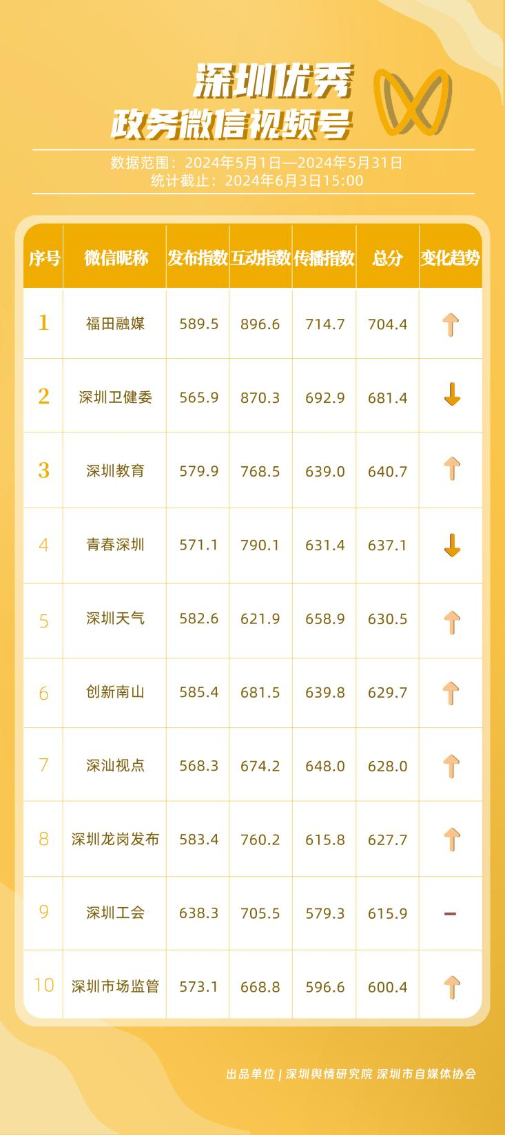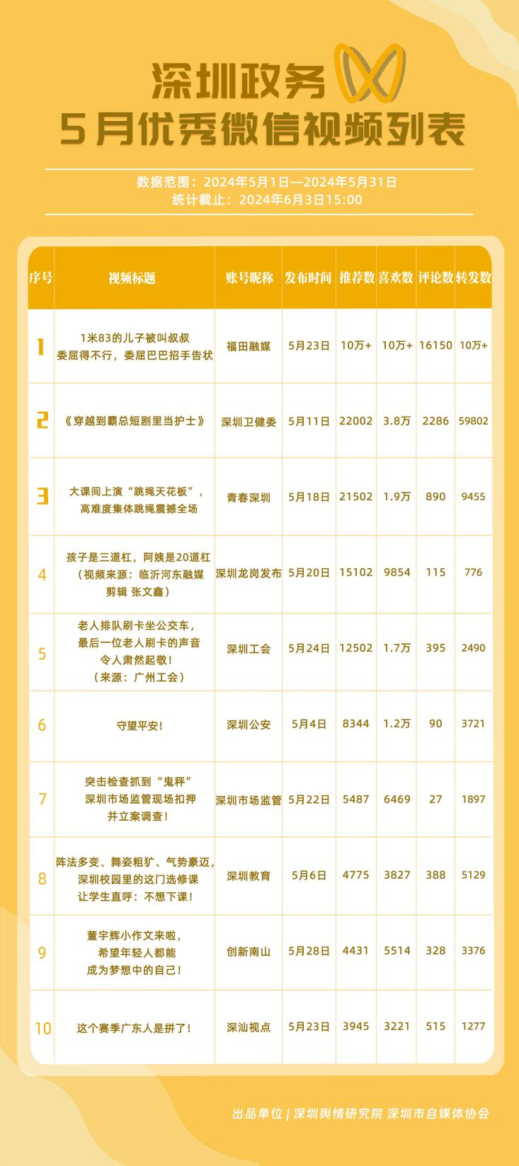 5月,“深圳衛(wèi)健委”“深圳龍崗發(fā)布”“i深圳”“幸福福田”“深圳交通”“深圳工會(huì)”“青春深圳”“羅湖發(fā)布”“深圳應(yīng)急管理”“深圳教育”等30個(gè)政務(wù)微信公眾號,被評為“深圳優(yōu)秀政務(wù)微信公眾號”。5月,“深圳衛(wèi)健委”憑借精心創(chuàng)作的內(nèi)容、與受眾深入互動(dòng),多篇作品深受好評,榮登榜單首位。“深圳龍崗發(fā)布”“i深圳”“幸福福田”“深圳交通”等上榜公眾號也積極捕捉觀眾優(yōu)質(zhì)作品需求,把握主流熱點(diǎn)趨勢,集中發(fā)揮政務(wù)媒體傳播力量,在本期也取得了較為亮眼的成績,進(jìn)一步推動(dòng)了政務(wù)信息傳播工作提質(zhì)增效。