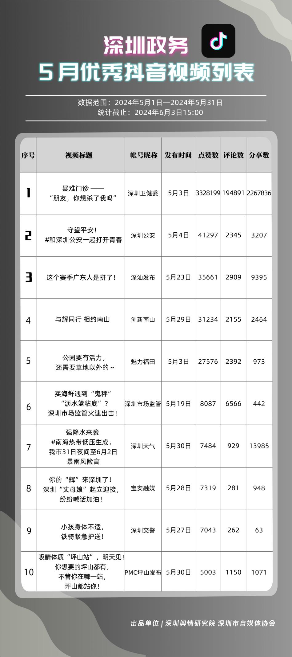 5月,共有10個(gè)政務(wù)抖音號獲得“深圳優(yōu)秀政務(wù)抖音號”稱號,分別是“深圳衛(wèi)健委”“魅力福田”“DOU愛龍華”“創(chuàng)新南山”“深圳天氣”“深汕發(fā)布”“掌上龍崗”“深圳交警”“PMC坪山發(fā)布”和“深圳公安”,多個(gè)政務(wù)抖音號能夠把握短視頻平臺(tái)宣傳要領(lǐng),持續(xù)發(fā)布優(yōu)質(zhì)信息內(nèi)容,做到了政務(wù)便民化、政務(wù)信息傳播高效化,為政務(wù)信息發(fā)布模式開創(chuàng)新渠道樹立了良好典范。