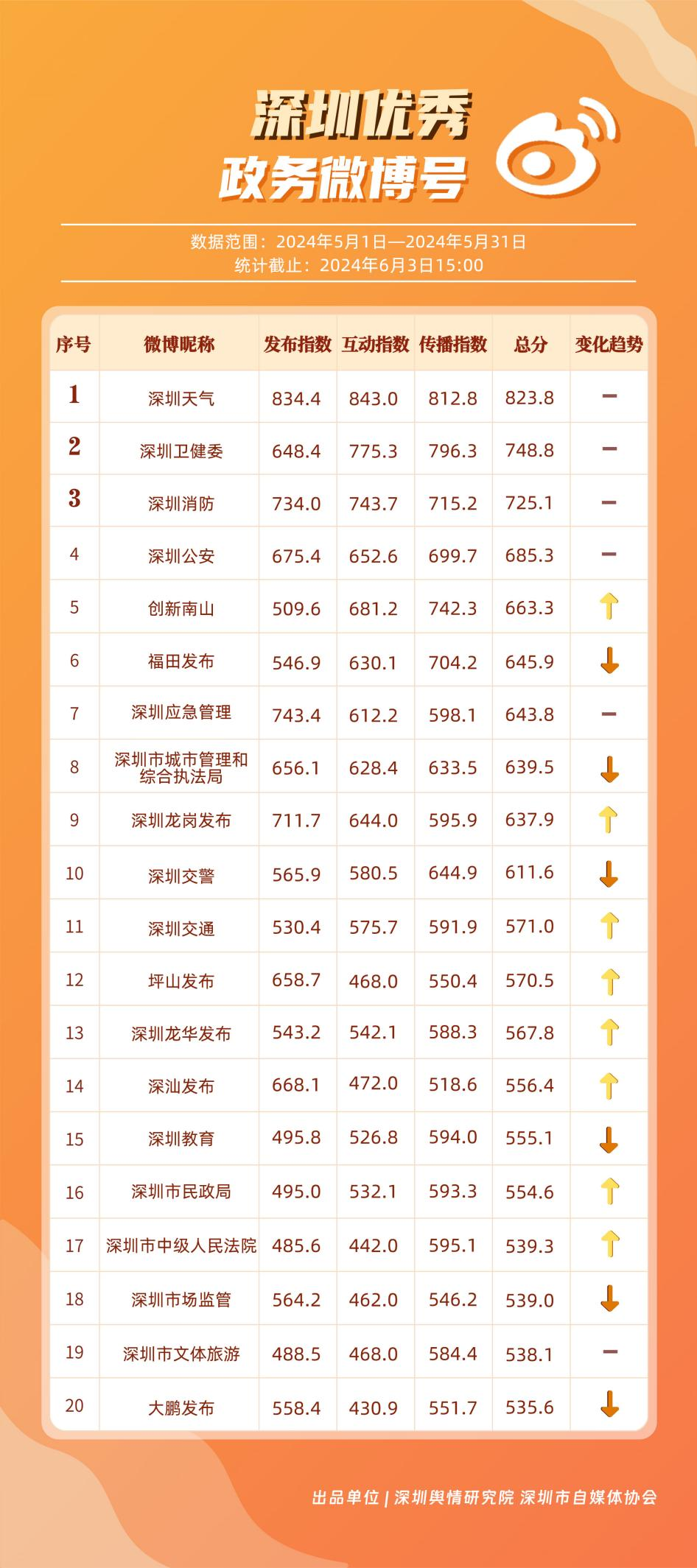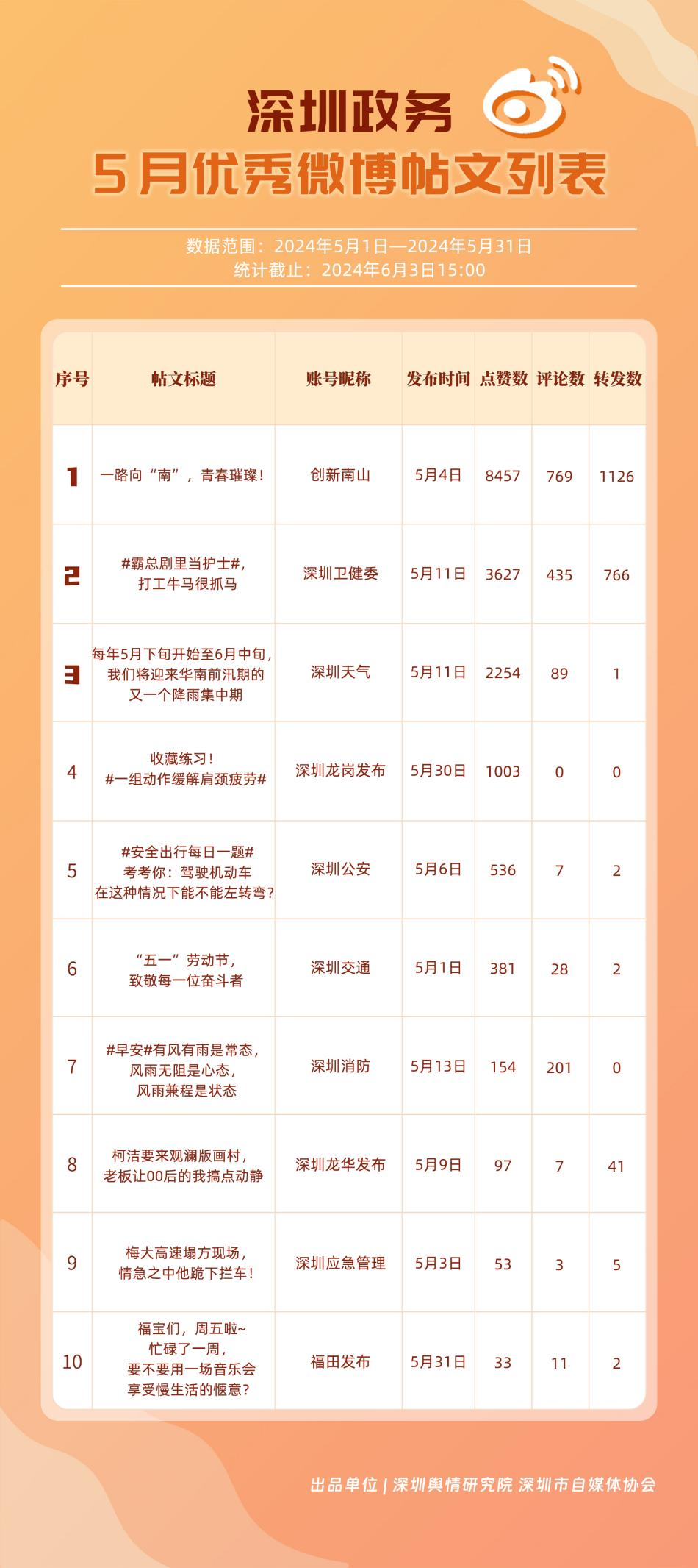 5月,“深圳天氣”“深圳衛(wèi)健委”“深圳消防”“深圳公安”“創(chuàng)新南山”“福田發(fā)布”“深圳應(yīng)急管理”“深圳市城市管理和綜合執(zhí)法局”“深圳龍崗發(fā)布”“深圳交警”等20個(gè)政務(wù)微博號入列“優(yōu)秀”名單。對比上期來看,“深圳天氣”“深圳衛(wèi)健委”“深圳消防”“深圳公安”發(fā)揮穩(wěn)定,能夠合理利用微博傳播渠道,持續(xù)輸出受眾喜聞樂見的高質(zhì)量內(nèi)容,“創(chuàng)新南山”“深圳龍崗發(fā)布”等微博號則在5月發(fā)力宣傳,整體傳播效果有所提升,收獲網(wǎng)民好評。