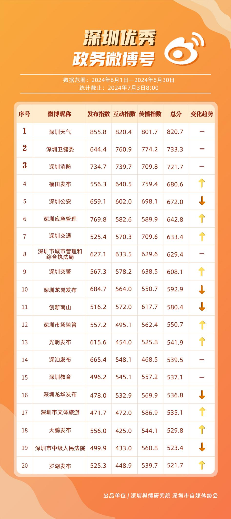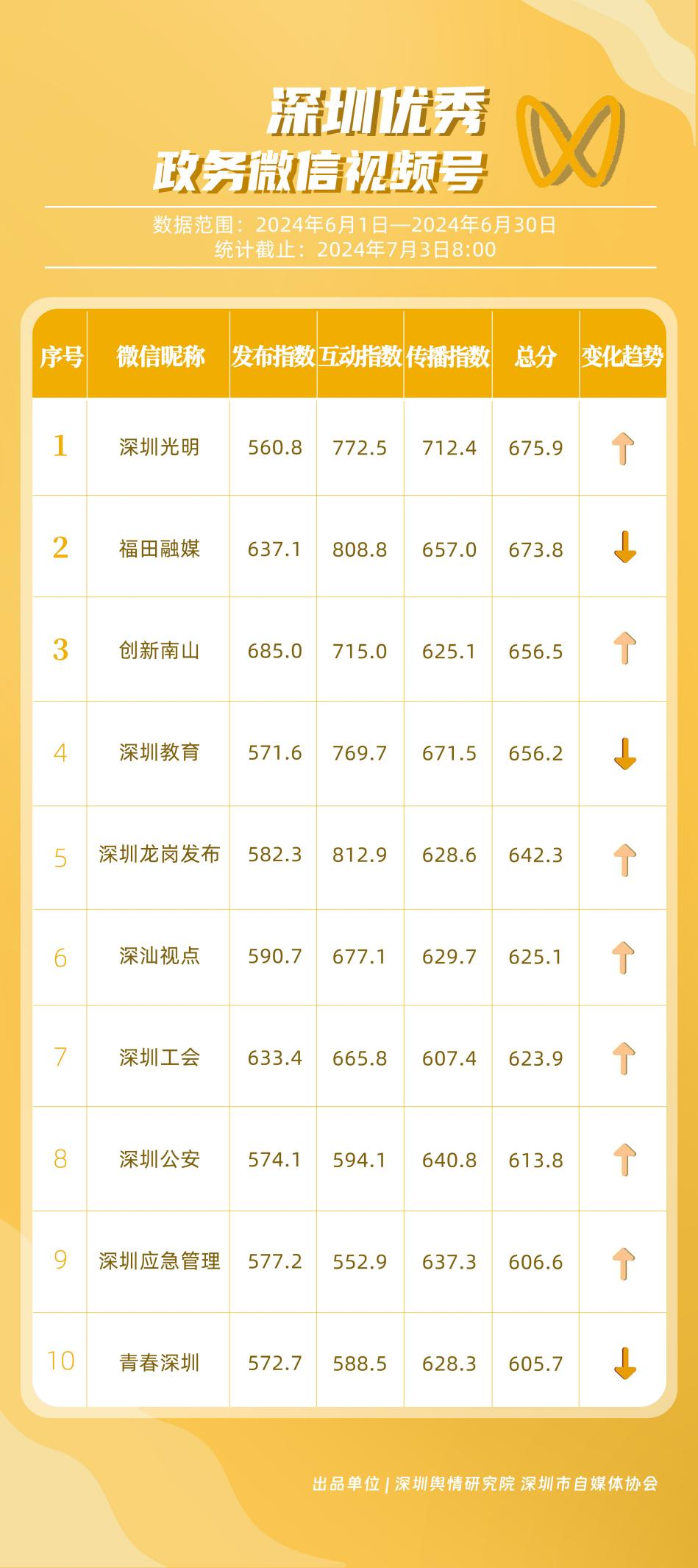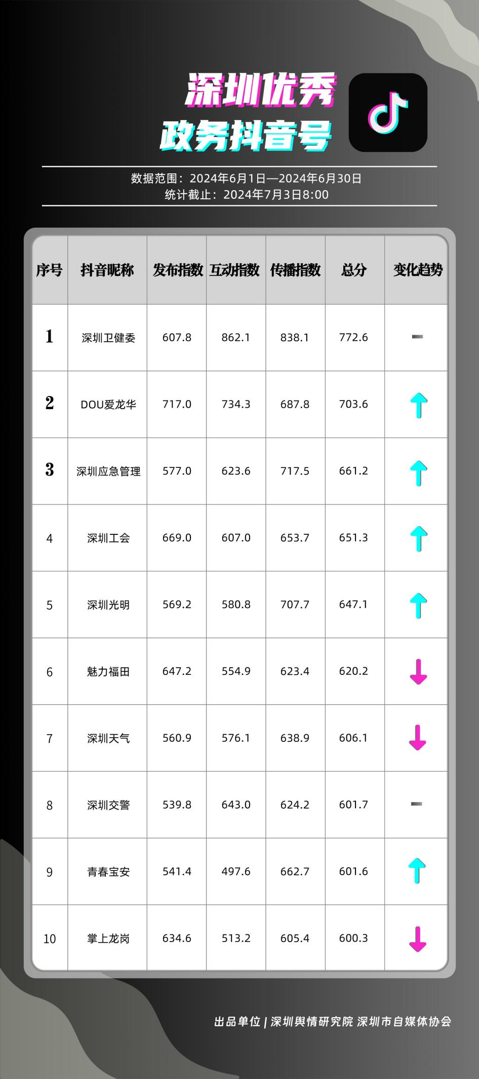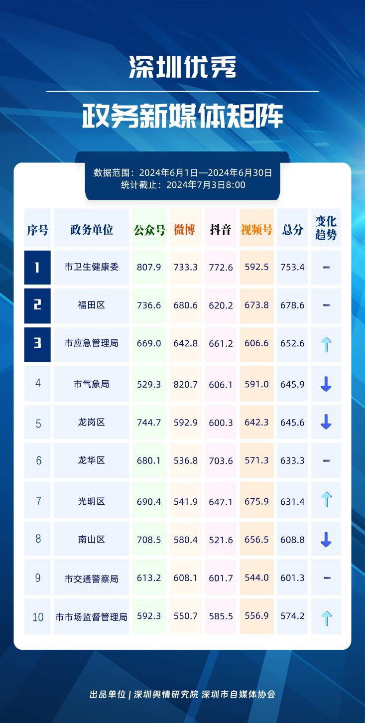 榜單在持續(xù)展示深圳政務(wù)新媒體矩陣建設(shè)成效的同時,梳理總結(jié)了深圳政務(wù)微信公眾號、微信視頻號、微博號、抖音號、頭條號的運營方法與經(jīng)驗,是政務(wù)公開、回應(yīng)群眾關(guān)切的重要載體。6月,又有哪些政務(wù)新媒體取得優(yōu)異成績呢?《深圳優(yōu)秀政務(wù)新媒體矩陣》(2024年6月期)邀您共同關(guān)注。