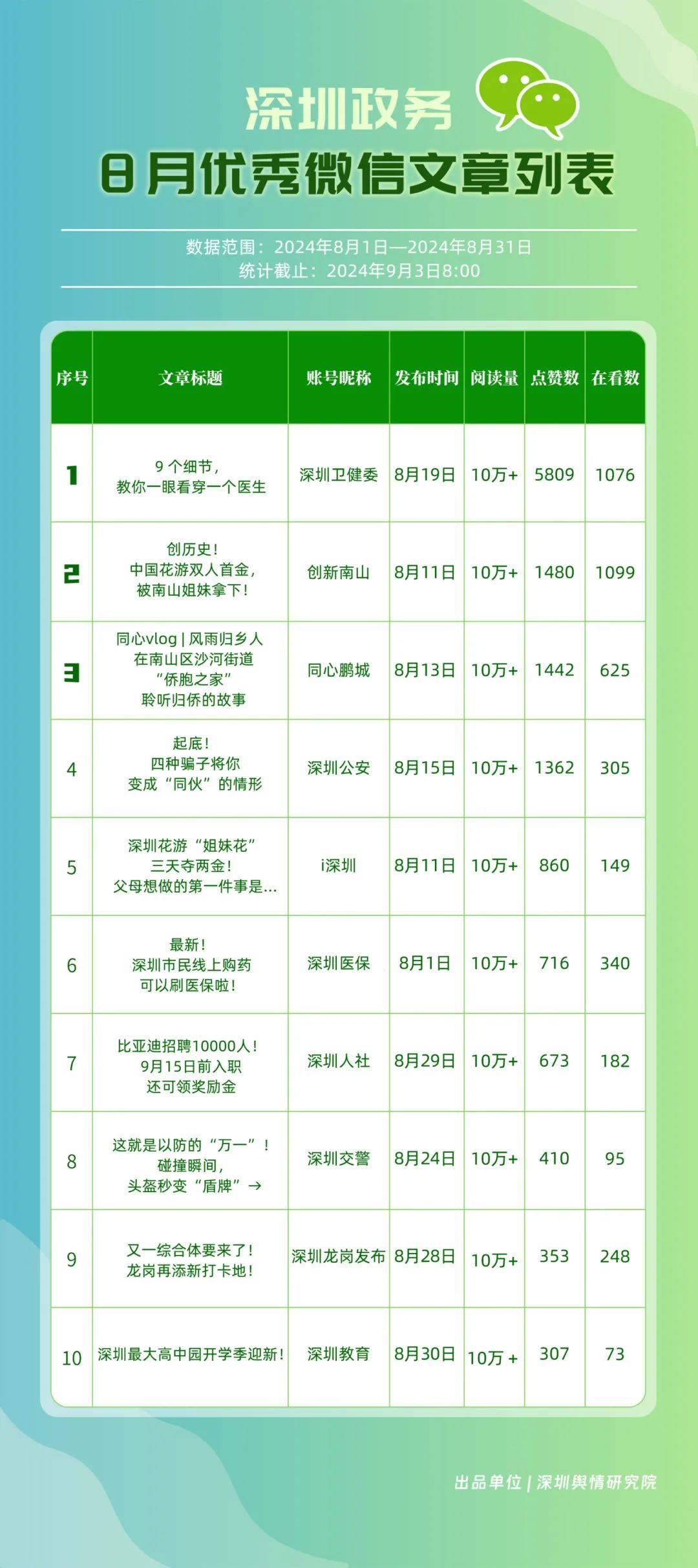 8月,“深圳衛(wèi)健委”“深圳龍崗發(fā)布”“幸福福田”“i深圳”“創(chuàng)新南山”“同心鵬城”“深圳交通”“青春深圳”“濱海寶安”“深圳光明”等30個賬號入選“深圳優(yōu)秀政務微信公眾號”。其中,榜單前四名的“深圳衛(wèi)健委”“深圳龍崗發(fā)布”“幸福福田”“i深圳”以其高質量的內容和有效的信息傳播策略,持續(xù)獲得公眾較高關注度,排名未產生變動。緊隨其后的“創(chuàng)新南山”“同心鵬城”“深圳交通”等賬號也在內容風格、質量等方面展現了非凡的實力,獲得了積極反響。
