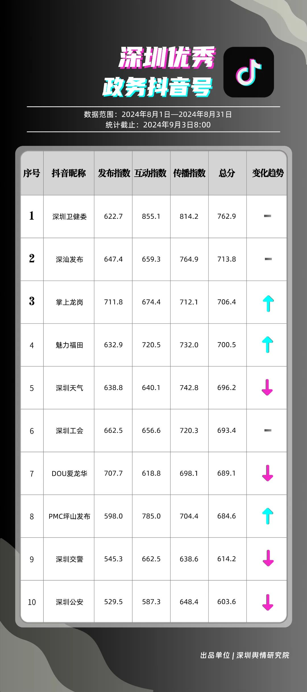 8月,“深圳衛(wèi)健委”“深汕發(fā)布”“掌上龍崗”“魅力福田”“深圳天氣”“深圳工會”“DOU愛龍華”“PMC坪山發(fā)布”“深圳交警”和“深圳公安”共10個政務抖音號獲得優(yōu)秀稱號,“深圳衛(wèi)健委”“深汕發(fā)布”“掌上龍崗”以高分居榜單前三,賬號有關“醫(yī)師節(jié)”“猴痘”“奧運金牌”的視頻獲得了較高的關注度和討論度,相關優(yōu)秀視頻在傳播信息的同時,也展現了深圳政務抖音號在內容質量、互動性和傳播度方面的實力。