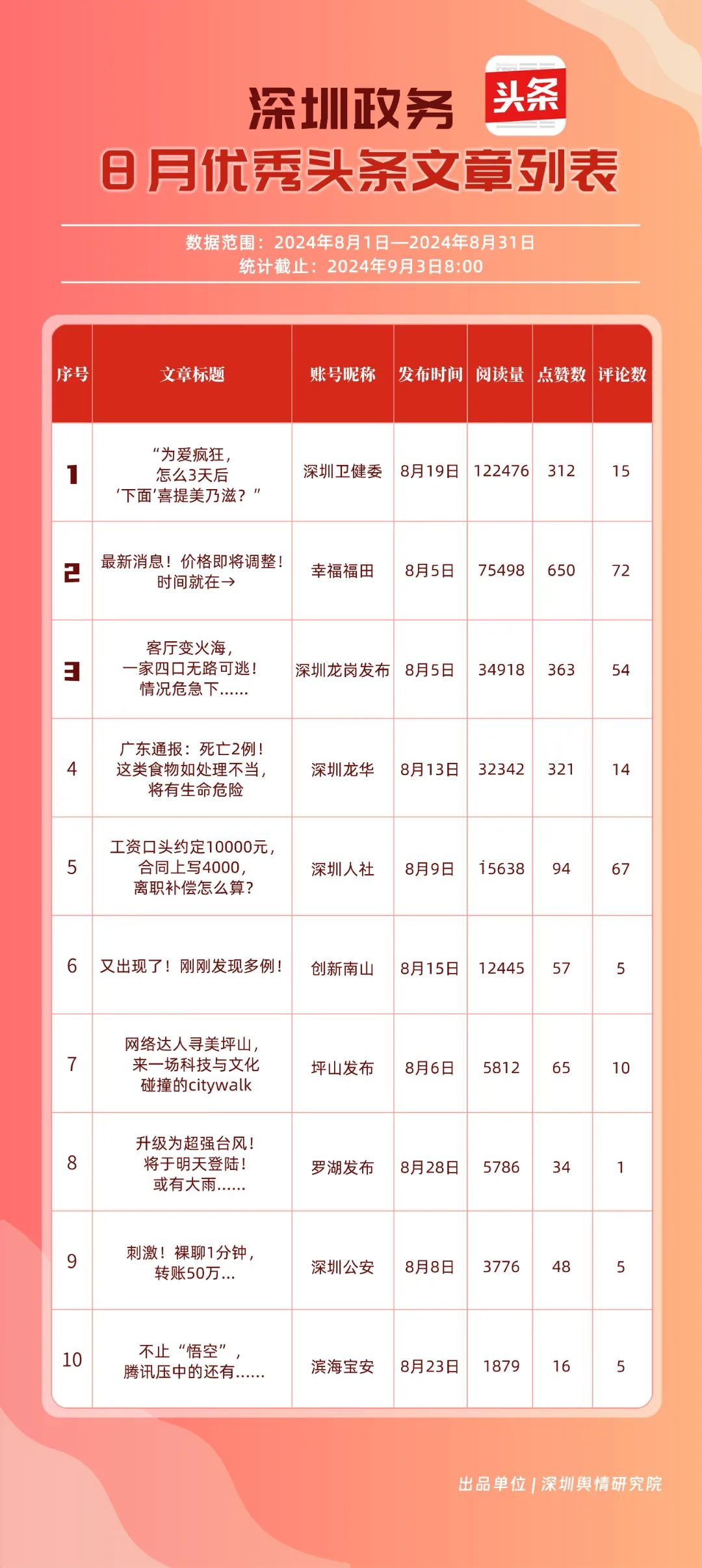 8月,“幸福福田”“深圳龍崗發(fā)布”“深圳衛(wèi)健委”“深圳龍華”“創(chuàng)新南山”“深圳人社”“深圳光明”“羅湖發(fā)布”“濱海寶安”和“坪山發(fā)布”共10個政務頭條號入選榜單。相關賬號的文章《“為愛瘋狂,怎么3天后‘下面’喜提美乃滋?”》《最新消息!價格即將調整!時間就在→》等貼近民生,傳遞實用信息,收獲了較高的閱讀量和點贊數。