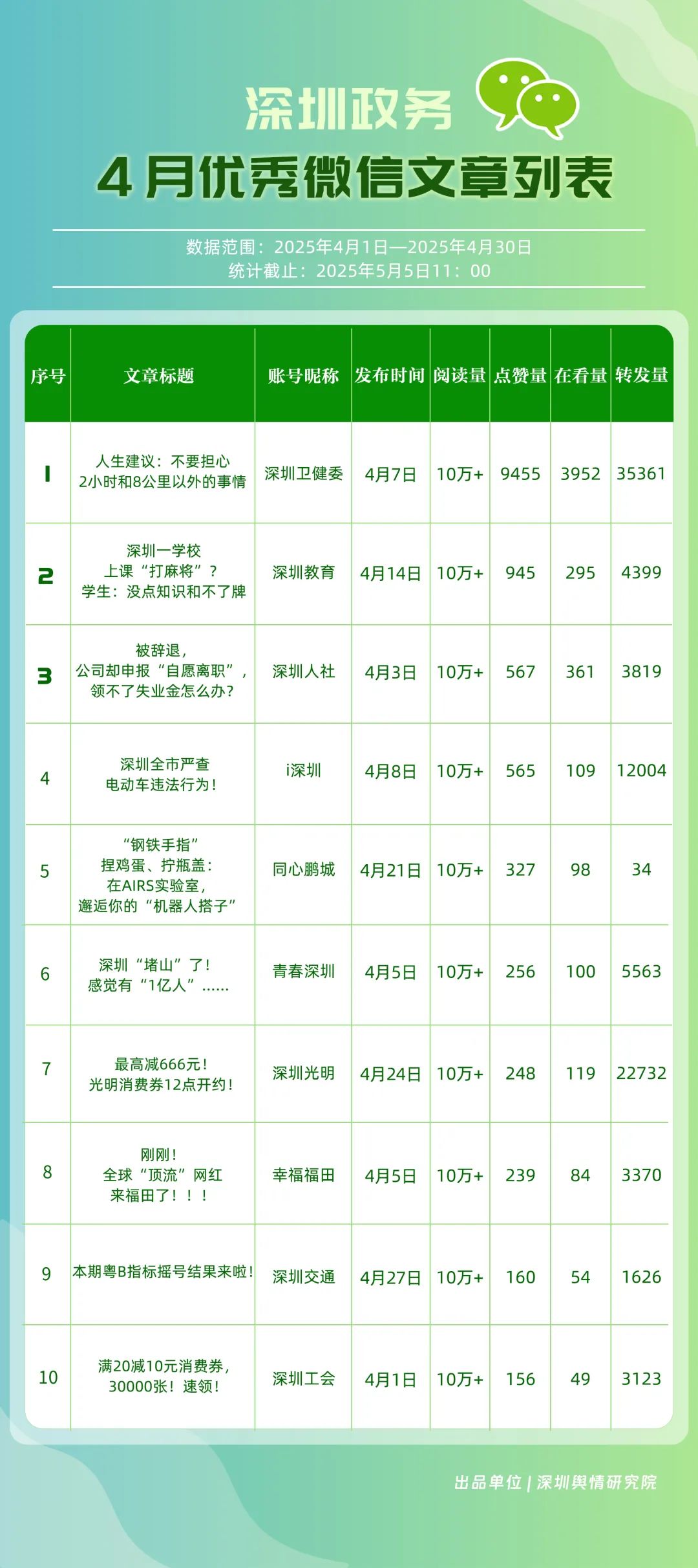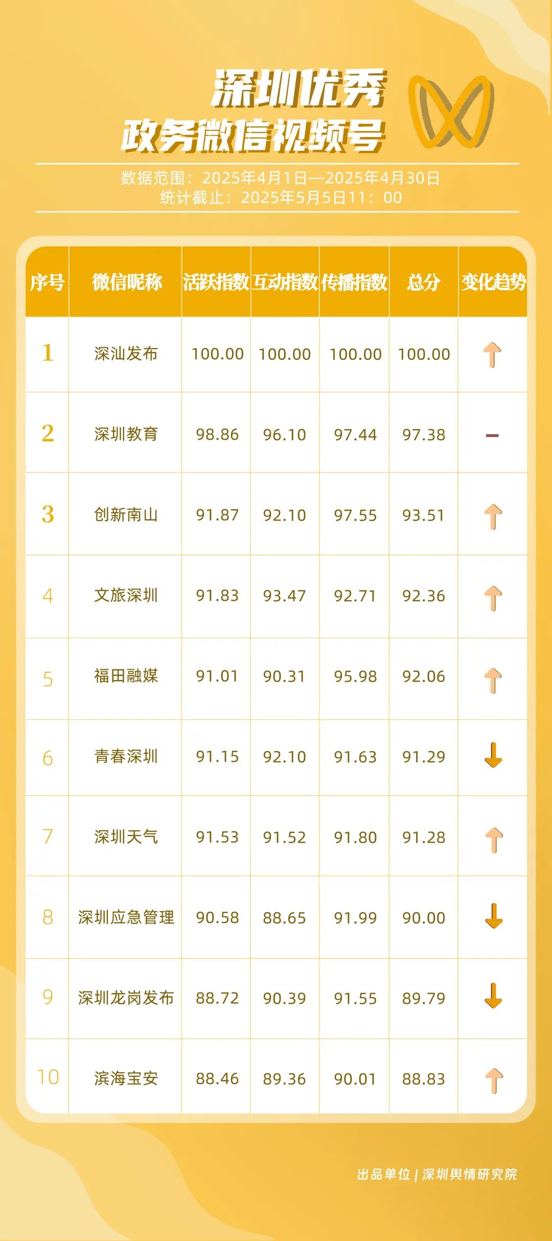 2025年4月期《深圳優(yōu)秀政務(wù)新媒體矩陣》發(fā)布,讓我們共同關(guān)注哪些矩陣以精準(zhǔn)傳播、智慧服務(wù)與創(chuàng)新實(shí)踐,在政務(wù)新媒體領(lǐng)域打造出具有示范價值的標(biāo)桿案例,以矩陣合力構(gòu)建政務(wù)傳播新生態(tài),為深圳城市網(wǎng)絡(luò)形象塑造持續(xù)注入新動能。