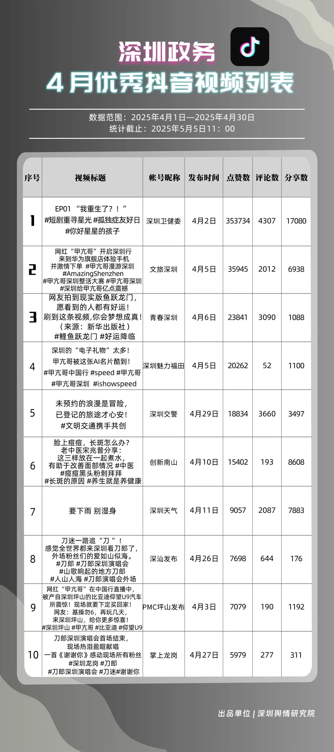 4月,“深圳衛(wèi)健委”“文旅深圳”“青春深圳”“深圳天氣”“深汕發(fā)布”“掌上龍崗”“深圳魅力福田”“深圳交警”“創(chuàng)新南山”“DOU愛龍華”共10個政務(wù)抖音號獲得“優(yōu)秀政務(wù)抖音號”稱號。4月,“深圳衛(wèi)健委”“文旅深圳”“青春深圳”憑借新穎的內(nèi)容策劃、生動的短視頻呈現(xiàn)方式,實(shí)現(xiàn)排名提升,位居榜單前三?!吧钲谔鞖狻薄吧钌前l(fā)布”緊隨其后,以優(yōu)質(zhì)實(shí)用的內(nèi)容、接地氣的表達(dá),持續(xù)擴(kuò)大政務(wù)新媒體的傳播聲量。上榜賬號積極探索創(chuàng)新傳播路徑,以生動有趣的方式傳遞政務(wù)信息,為深圳政務(wù)新媒體在短視頻領(lǐng)域的發(fā)展注入新活力。