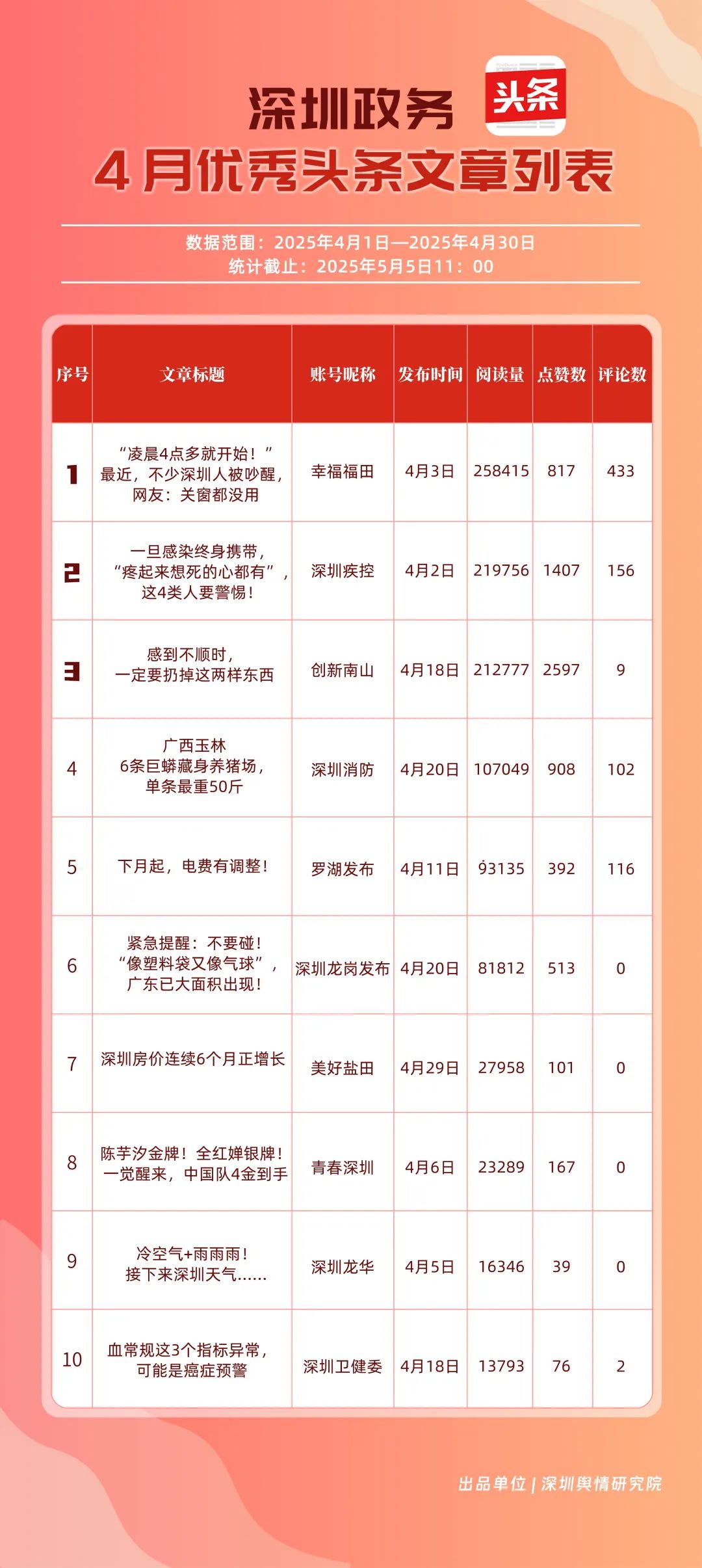 4月,“幸福福田”“深圳疾控”“創(chuàng)新南山”“深圳消防”“羅湖發(fā)布”“深圳龍崗發(fā)布”“坪山發(fā)布”“深圳龍華”“青春深圳”“濱海寶安”共10個政務(wù)頭條號入選“優(yōu)秀政務(wù)頭條號”榜單?!靶腋8L铩毖永m(xù)上月的優(yōu)異表現(xiàn),以優(yōu)質(zhì)的內(nèi)容輸出和穩(wěn)定的用戶互動,位列榜單首位,成為政務(wù)頭條號的標(biāo)桿;“深圳疾控”則以92.39分的亮眼成績排在榜單第二位,凸顯了政務(wù)新媒體在公共衛(wèi)生領(lǐng)域的傳播成果;“創(chuàng)新南山”“深圳消防”“羅湖發(fā)布”緊隨其后,分別在城區(qū)形象宣傳、消防安全領(lǐng)域等方面深耕細(xì)作,持續(xù)擴(kuò)大政務(wù)信息的覆蓋面與影響力。