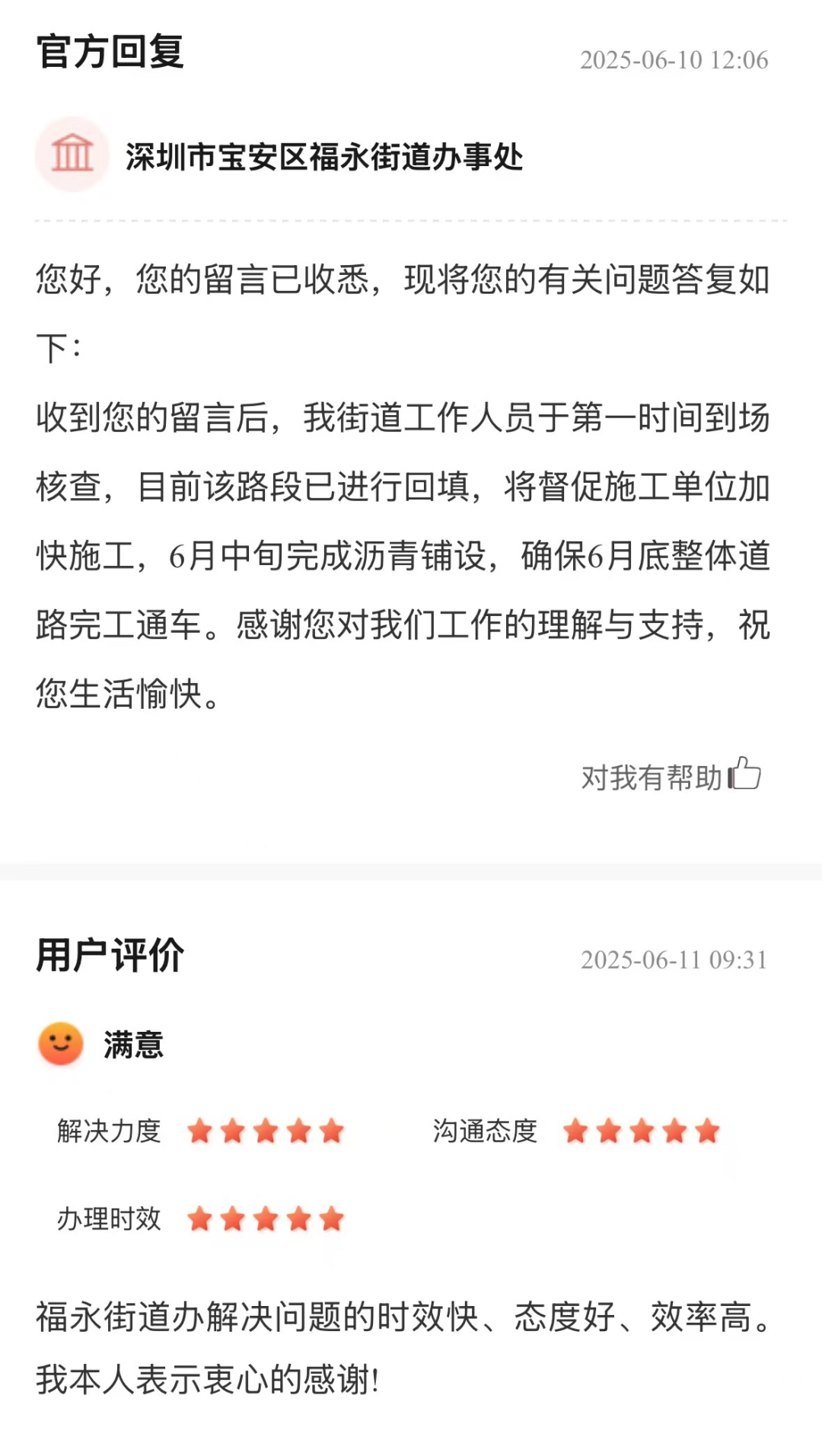 案例點(diǎn)評:道路銜接處的大坑大坎影響通行安全與道路順暢,亟待解決。街道辦收到留言后迅速行動(dòng),第一時(shí)間到場核查,明確將督促施工單位加快進(jìn)度,在預(yù)計(jì)時(shí)間內(nèi)完成瀝青鋪設(shè)及道路整體完工,這些舉措體現(xiàn)了對道路通行問題的重視和高效的處理能力,為保障道路正常通行提供了有力保障,獲得了市民的滿意評價(jià)。