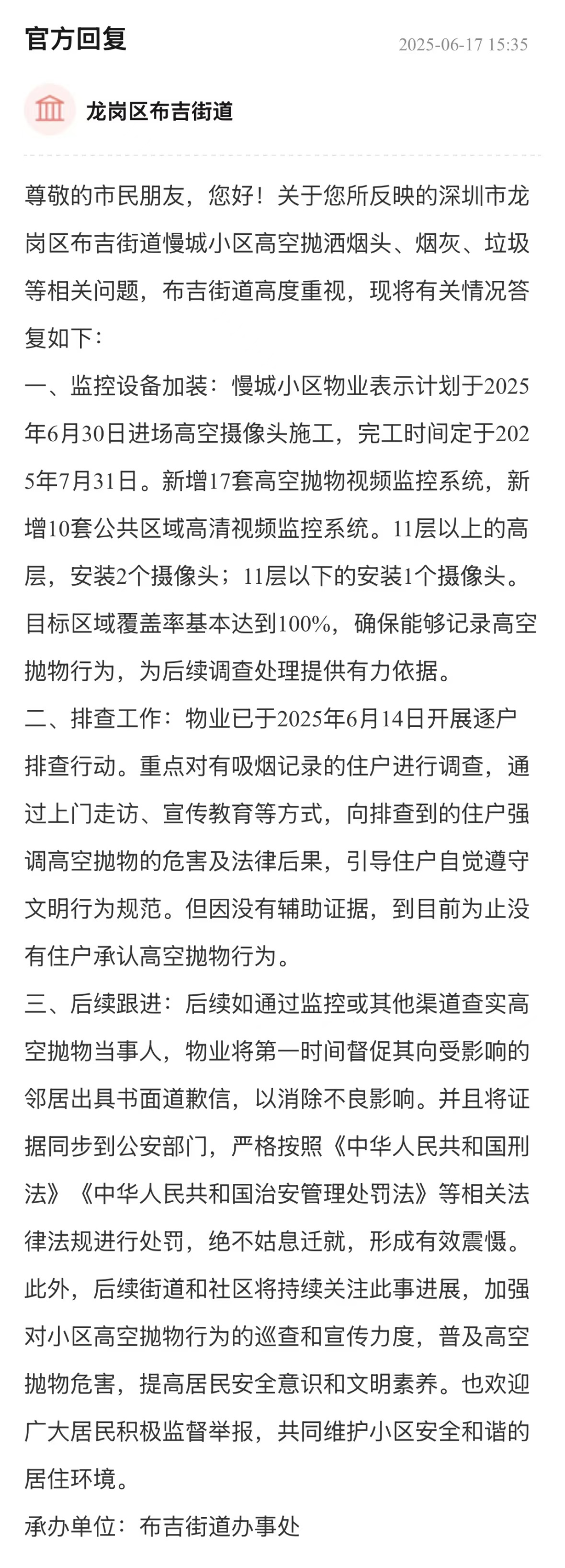 高空拋物嚴(yán)重威脅居民人身與財(cái)產(chǎn)安全,需嚴(yán)肅對待。街道辦接到相關(guān)反映后,積極推動(dòng)物業(yè)規(guī)劃加裝視頻監(jiān)控系統(tǒng),明確了施工和完工時(shí)間,同時(shí)安排物業(yè)開展逐戶排查,重點(diǎn)調(diào)查有吸煙記錄住戶,體現(xiàn)出對問題的重視和解決問題的行動(dòng)力。在后續(xù)保障方面,明確查實(shí)拋物當(dāng)事人后將督促其道歉并交由公安部門依規(guī)處罰,街道和社區(qū)也將持續(xù)關(guān)注、加強(qiáng)巡查與宣傳,為維護(hù)小區(qū)安全提供了有力支持。