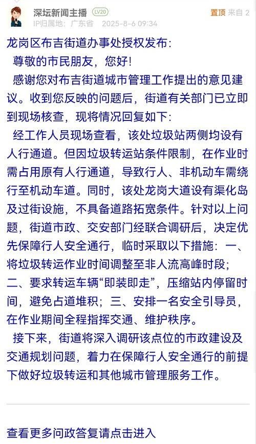 經(jīng)工作人員現(xiàn)場查看,該處垃圾站兩側(cè)均設(shè)有人行通道。但因垃圾轉(zhuǎn)運(yùn)站條件限制,在作業(yè)時(shí)需占用原有人行通道,導(dǎo)致行人、非機(jī)動車需繞行至機(jī)動車道。同時(shí),該處龍崗大道設(shè)有渠化島及過街設(shè)施,不具備道路拓寬條件。針對以上問題,街道市政、交安部門經(jīng)聯(lián)合調(diào)研后,決定優(yōu)先保障行人安全通行,臨時(shí)采取以下措施:一、將垃圾轉(zhuǎn)運(yùn)作業(yè)時(shí)間調(diào)整至非人流高峰時(shí)段;二、要求轉(zhuǎn)運(yùn)車輛“即裝即走”,壓縮站內(nèi)停留時(shí)間,避免占道堆積;三、安排一名安全引導(dǎo)員,在作業(yè)期間全程指揮交通、維護(hù)秩序。