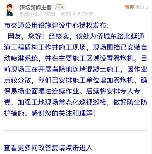 網(wǎng)友,您好!經(jīng)核實(shí),該處為僑城東路北延通道工程盾構(gòu)工作井施工現(xiàn)場,現(xiàn)場圍擋已安裝自動噴淋系統(tǒng),并在主要施工區(qū)域設(shè)置霧炮機(jī)。目前現(xiàn)場正在開展鑿除地連墻混凝土施工,因作業(yè)點(diǎn)較分散,我們已安排施工單位增加霧炮機(jī),確保易揚(yáng)塵面濕法連續(xù)作業(yè)。后續(xù)將安排專人專責(zé),加強(qiáng)工地現(xiàn)場常態(tài)化巡視巡檢,做好防塵防護(hù)措施。感謝您的關(guān)注和理解!