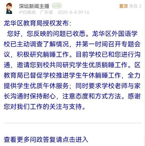 您好,您反映的問題已收悉。龍華區(qū)外國語學(xué)校已主動調(diào)查了解情況,并第一時(shí)間召開專題會議,積極研究躺睡工作。目前學(xué)校已和您進(jìn)行溝通,邀請您到校共同研究學(xué)生優(yōu)質(zhì)躺睡工作。區(qū)教育局已督促學(xué)校推進(jìn)學(xué)生午休躺睡工作,全力提供學(xué)生優(yōu)質(zhì)午休服務(wù);同時(shí)要求學(xué)校老師與家長溝通時(shí)保持耐心,注意態(tài)度和方式方法。感謝您對我們工作的關(guān)注與支持。