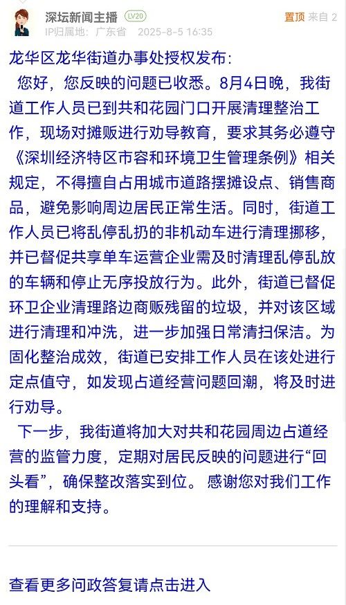 您好,您反映的問題已收悉。8月4日晚,我街道工作人員已到共和花園門口開展清理整治工作,現(xiàn)場對攤販進(jìn)行勸導(dǎo)教育,要求其務(wù)必遵守《深圳經(jīng)濟(jì)特區(qū)市容和環(huán)境衛(wèi)生管理?xiàng)l例》相關(guān)規(guī)定,不得擅自占用城市道路擺攤設(shè)點(diǎn)、銷售商品,避免影響周邊居民正常生活。同時(shí),街道工作人員已將亂停亂扔的非機(jī)動車進(jìn)行清理挪移,并已督促共享單車運(yùn)營企業(yè)需及時(shí)清理亂停亂放的車輛和停止無序投放行為。此外,街道已督促環(huán)衛(wèi)企業(yè)清理路邊商販殘留的垃圾,并對該區(qū)域進(jìn)行清理和沖洗,進(jìn)一步加強(qiáng)日常清掃保潔。為固化整治成效,街道已安排工作人員在該處進(jìn)行定點(diǎn)值守,如發(fā)現(xiàn)占道經(jīng)營問題回潮,將及時(shí)進(jìn)行勸導(dǎo)。