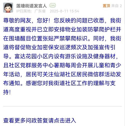 尊敬的網(wǎng)友,您好!您反映的問題已收悉,我街道高度重視并已立即安排物業(yè)加裝防攀爬護(hù)欄并在圍墻醒目位置張貼嚴(yán)禁攀爬標(biāo)識。同時(shí),我街道將督促物業(yè)加密保安巡邏頻次及加強(qiáng)宣傳引導(dǎo)。富達(dá)花園小區(qū)內(nèi)設(shè)有游樂設(shè)施及健身器材,且社區(qū)黨群服務(wù)中心暑期每周會開展兒童和青少年活動,居民可關(guān)注仙湖社區(qū)居民微信群活動發(fā)布通知。感謝您對我街道社區(qū)工作的理解與支持!