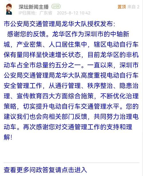 感謝您的反饋。龍華區(qū)作為深圳市的中軸新城,產(chǎn)業(yè)密集、人口居住集中,轄區(qū)電動自行車保有量同樣呈快速增長狀態(tài),目前龍華區(qū)的非機(jī)動車占全市總量約五分之一。一直以來,深圳市公安局交通管理局龍華大隊(duì)高度重視電動自行車安全管理工作,從通行管理、秩序整治、隱患治理、宣傳教育四大方面綜合施策,不斷優(yōu)化治理策略,切實(shí)提升電動自行車交通管理水平。您的建議我們也會向相關(guān)部門反饋,共同努力治理電動車。再次感謝您對交通管理工作的支持和理解!