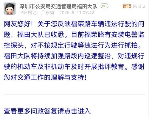 網(wǎng)友您好!關(guān)于您反映福榮路車輛違法行駛的問題,福田大隊(duì)已收悉。目前福榮路有安裝電警監(jiān)控探頭,對不按規(guī)定行駛等違法行為進(jìn)行抓拍。福田大隊(duì)將持續(xù)加強(qiáng)路段內(nèi)巡邏整治,對違規(guī)行駛的機(jī)動車及非機(jī)動車及時(shí)開展批評教育。感謝您對交通工作的理解與支持!
