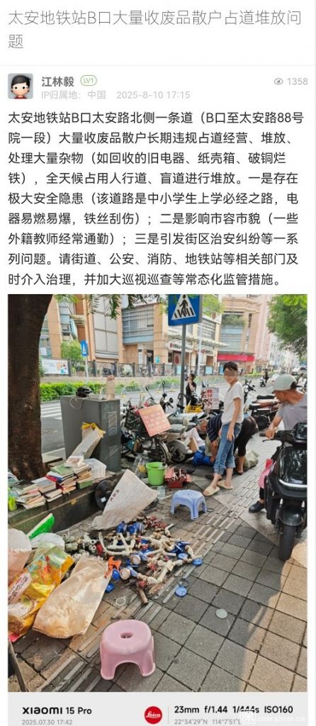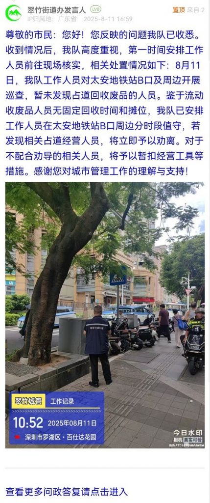 尊敬的市民:您好!您反映的問題我隊(duì)已收悉。收到情況后,我隊(duì)高度重視,第一時(shí)間安排工作人員前往現(xiàn)場核實(shí),相關(guān)處置情況如下:8月11日,我隊(duì)工作人員對太安地鐵站B口及周邊開展巡查,暫未發(fā)現(xiàn)占道回收廢品的人員。鑒于流動收廢品人員無固定回收時(shí)間和攤位,我隊(duì)已安排工作人員在太安地鐵站B口周邊分時(shí)段值守,若發(fā)現(xiàn)相關(guān)占道經(jīng)營人員,將立即予以勸離。對于不配合勸導(dǎo)的相關(guān)人員,將予以暫扣經(jīng)營工具等措施。感謝您對城市管理工作的理解與支持!