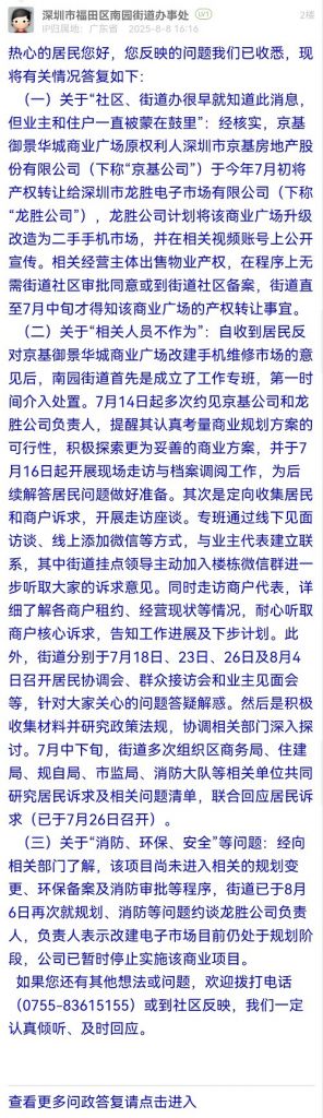 (二)關(guān)于“相關(guān)人員不作為”:自收到居民反對京基御景華城商業(yè)廣場改建手機(jī)維修市場的意見后,南園街道首先是成立了工作專班,第一時(shí)間介入處置。7月14日起多次約見京基公司和龍勝公司負(fù)責(zé)人,提醒其認(rèn)真考量商業(yè)規(guī)劃方案的可行性,積極探索更為妥善的商業(yè)方案,并于7月16日起開展現(xiàn)場走訪與檔案調(diào)閱工作,為后續(xù)解答居民問題做好準(zhǔn)備。其次是定向收集居民和商戶訴求,開展走訪座談。專班通過線下見面訪談、線上添加微信等方式,與業(yè)主代表建立聯(lián)系,其中街道掛點(diǎn)領(lǐng)導(dǎo)主動加入樓棟微信群進(jìn)一步聽取大家的訴求意見。同時(shí)走訪商戶代表,詳細(xì)了解各商戶租約、經(jīng)營現(xiàn)狀等情況,耐心聽取商戶核心訴求,告知工作進(jìn)展及下步計(jì)劃。此外,街道分別于7月18日、23日、26日及8月4日召開居民協(xié)調(diào)會、群眾接訪會和業(yè)主見面會等,針對大家關(guān)心的問題答疑解惑。然后是積極收集材料并研究政策法規(guī),協(xié)調(diào)相關(guān)部門深入探討。7月中下旬,街道多次組織區(qū)商務(wù)局、住建局、規(guī)自局、市監(jiān)局、消防大隊(duì)等相關(guān)單位共同研究居民訴求及相關(guān)問題清單,聯(lián)合回應(yīng)居民訴求(已于7月26日召開)。
