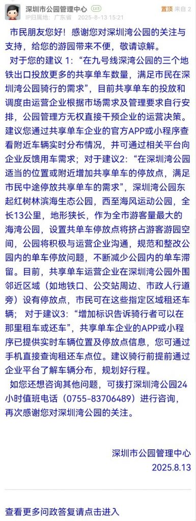 對于您的建議 1:“在九號線深灣公園的三個(gè)地鐵出口投放更多的共享單車數(shù)量,滿足市民在深圳灣公園騎行的需求”,目前共享單車的投放和調(diào)度由運(yùn)營企業(yè)根據(jù)市場需求及管理要求自行安排,公園管理方無權(quán)直接干預(yù)企業(yè)的運(yùn)營決策。建議您通過共享單車企業(yè)的官方APP或小程序查看附近車輛實(shí)時(shí)分布情況,并可通過相關(guān)平臺向企業(yè)反饋用車需求;對于建議2:“在深圳灣公園適當(dāng)?shù)奈恢没蚋浇黾庸蚕韱诬嚨耐7劈c(diǎn),滿足市民中途停放共享單車的需求”,深圳灣公園東起紅樹林濱海生態(tài)公園,西至海風(fēng)運(yùn)動公園,全長13公里,地形狹長,作為全市游客量最大的海灣公園,設(shè)置共單車停放點(diǎn)將擠占游客游園空間,公園將積極與運(yùn)營企業(yè)溝通,規(guī)范和整改公園內(nèi)的單車停放問題,不斷減少公園內(nèi)的單車滯留。目前,共享單車運(yùn)營企業(yè)在深圳灣公園外圍鄰近區(qū)域(如地鐵口、公交站周邊、市政人行道旁)設(shè)有停放點(diǎn),市民可在這些指定區(qū)域租還車輛; 對于建議3:“增加標(biāo)識告訴騎行者可以在那里租車或還車”,共享單車企業(yè)的APP或小程序已提供實(shí)時(shí)車輛位置及停放點(diǎn)信息,您可通過手機(jī)直接查詢租還車點(diǎn)位。建議騎行前提前通過企業(yè)平臺了解車輛分布,規(guī)劃好行程。