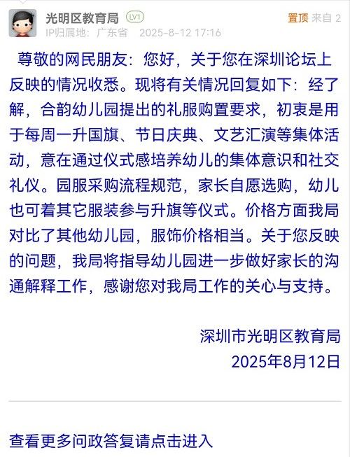 尊敬的網(wǎng)民朋友:您好,關(guān)于您在深圳論壇上反映的情況收悉。現(xiàn)將有關(guān)情況回復(fù)如下:經(jīng)了解,合韻幼兒園提出的禮服購置要求,初衷是用于每周一升國旗、節(jié)日慶典、文藝匯演等集體活動,意在通過儀式感培養(yǎng)幼兒的集體意識和社交禮儀。園服采購流程規(guī)范,家長自愿選購,幼兒也可著其它服裝參與升旗等儀式。價(jià)格方面我局對比了其他幼兒園,服飾價(jià)格相當(dāng)。關(guān)于您反映的問題,我局將指導(dǎo)幼兒園進(jìn)一步做好家長的溝通解釋工作,感謝您對我局工作的關(guān)心與支持。