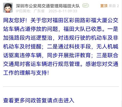網(wǎng)友您好!關(guān)于您對福田區(qū)彩田路彩福大廈公交站車輛占道停放的問題,福田大隊(duì)已收悉。一是加強(qiáng)路段內(nèi)巡邏整治,對違規(guī)行駛的機(jī)動車及非機(jī)動車及時(shí)提醒;二是通過科技手段,無人機(jī)喊話驅(qū)離違停車輛,同步開展批評教育;三是聯(lián)合交通局對客運(yùn)車輛進(jìn)行規(guī)范管理。感謝您對交通工作的理解與支持!