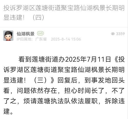 13. 帖文《投訴羅湖區(qū)蓮塘街道聚寶路仙湖楓景長(zhǎng)期明顯違建?。ㄋ模?/a>》