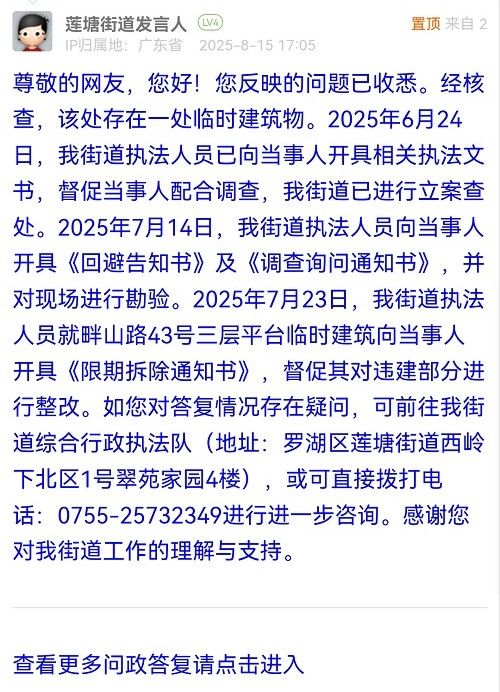 尊敬的網(wǎng)友,您好!您反映的問(wèn)題已收悉。經(jīng)核查,該處存在一處臨時(shí)建筑物。2025年6月24日,我街道執(zhí)法人員已向當(dāng)事人開(kāi)具相關(guān)執(zhí)法文書(shū),督促當(dāng)事人配合調(diào)查,我街道已進(jìn)行立案查處。2025年7月14日,我街道執(zhí)法人員向當(dāng)事人開(kāi)具《回避告知書(shū)》及《調(diào)查詢問(wèn)通知書(shū)》,并對(duì)現(xiàn)場(chǎng)進(jìn)行勘驗(yàn)。2025年7月23日,我街道執(zhí)法人員就畔山路43號(hào)三層平臺(tái)臨時(shí)建筑向當(dāng)事人開(kāi)具《限期拆除通知書(shū)》,督促其對(duì)違建部分進(jìn)行整改。如您對(duì)答復(fù)情況存在疑問(wèn),可前往我街道綜合行政執(zhí)法隊(duì)(地址:羅湖區(qū)蓮塘街道西嶺下北區(qū)1號(hào)翠苑家園4樓),或可直接撥打電話:0755-25732349進(jìn)行進(jìn)一步咨詢。感謝您對(duì)我街道工作的理解與支持。