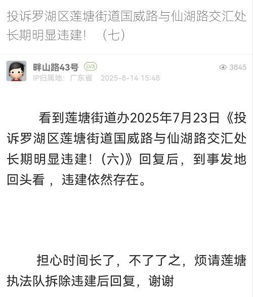 16. 帖文《投訴羅湖區(qū)蓮塘街道國(guó)威路與仙湖路交匯處長(zhǎng)期明顯違建?。ㄆ撸?/a>》