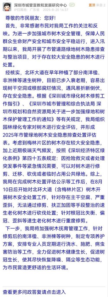 經(jīng)核實(shí),北環(huán)大道在早年種植了部分南洋楹、非洲楝等速生樹(shù)種,目前已步入衰老期,容易出現(xiàn)樹(shù)干空洞或根部腐爛情況,遇風(fēng)易折斷倒伏,存在安全隱患。根據(jù)《深圳城市綠化樹(shù)木修剪工作指引》、《深圳市城市管理和綜合執(zhí)法局 深圳市規(guī)劃和自然資源局關(guān)于進(jìn)一步加強(qiáng)綠地和樹(shù)木保護(hù)管理工作的通知》等有關(guān)規(guī)定,我局組織園林綠化專家對(duì)樹(shù)木進(jìn)行安全評(píng)估,并形成2025年市管綠地樹(shù)木安全隱患排查處置評(píng)估表??紤]到梅林片區(qū)的樹(shù)木存在較大安全隱患,加上近期極端天氣頻發(fā),按照《深圳經(jīng)濟(jì)特區(qū)綠化條例》第四十五條規(guī)定:因搶險(xiǎn)救災(zāi)或者處理突發(fā)事件等緊急情況需要,可以對(duì)樹(shù)木進(jìn)行修剪、遷移、砍伐或者臨時(shí)占用公共綠地。綜上,我局在完成樹(shù)木處置評(píng)估公示等工作后,在8月10日后開(kāi)始對(duì)北環(huán)大道(含梅林片區(qū))樹(shù)木開(kāi)展樹(shù)木安全處置工作,針對(duì)存在主干空腐、嚴(yán)重歪斜,無(wú)法通過(guò)修剪、扶正加固等手段整治的速生老化樹(shù)木進(jìn)行砍伐處置;針對(duì)根冠比失衡、偏冠、歪斜等速生老化樹(shù)木進(jìn)行重度修剪。