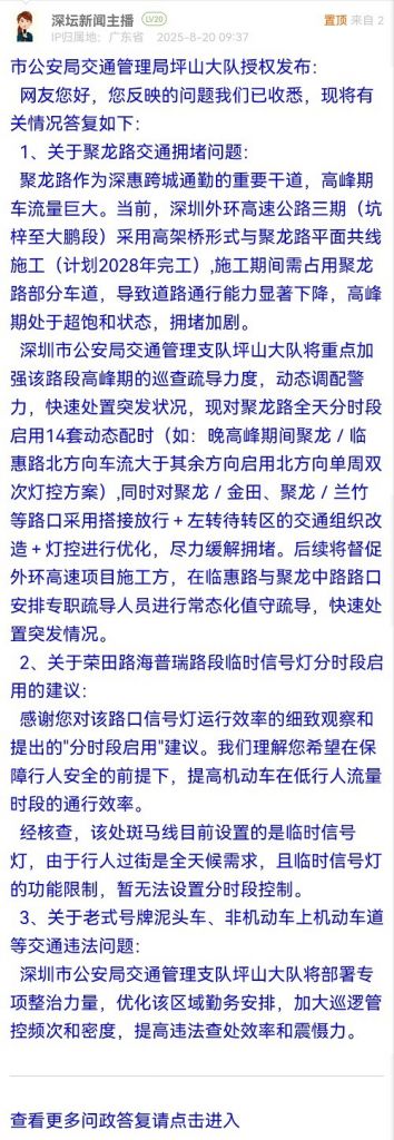 深圳市公安局交通管理支隊(duì)坪山大隊(duì)將重點(diǎn)加強(qiáng)該路段高峰期的巡查疏導(dǎo)力度,動(dòng)態(tài)調(diào)配警力,快速處置突發(fā)狀況,現(xiàn)對(duì)聚龍路全天分時(shí)段啟用14套動(dòng)態(tài)配時(shí)(如:晚高峰期間聚龍/臨惠路北方向車流大于其余方向啟用北方向單周雙次燈控方案),同時(shí)對(duì)聚龍/金田、聚龍/蘭竹等路口采用搭接放行+左轉(zhuǎn)待轉(zhuǎn)區(qū)的交通組織改造+燈控進(jìn)行優(yōu)化,盡力緩解擁堵。后續(xù)將督促外環(huán)高速項(xiàng)目施工方,在臨惠路與聚龍中路路口安排專職疏導(dǎo)人員進(jìn)行常態(tài)化值守疏導(dǎo),快速處置突發(fā)情況。