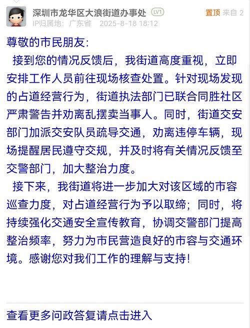 接下來(lái),我街道將進(jìn)一步加大對(duì)該區(qū)域的市容巡查力度,對(duì)占道經(jīng)營(yíng)行為予以取締;同時(shí),將持續(xù)強(qiáng)化交通安全宣傳教育,協(xié)調(diào)交警部門提高整治頻率,努力為市民營(yíng)造良好的市容與交通環(huán)境。感謝您對(duì)我們工作的理解與支持!