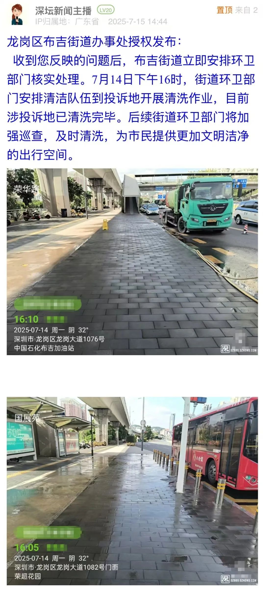 案例點評:對于市民反映的路面油污問題,布吉街道辦立即安排環(huán)衛(wèi)部門進(jìn)行清洗,并于第二日在問政帖文下進(jìn)行回復(fù),以現(xiàn)場圖片展示路面清理效果,表示將加強(qiáng)后續(xù)巡查。此次處置展現(xiàn)了基層部門高效務(wù)實的問題處理能力,為城市道路環(huán)境管理提供了快速響應(yīng)與長效維護(hù)相結(jié)合的實踐范例,切實回應(yīng)了市民對潔凈環(huán)境的期待。