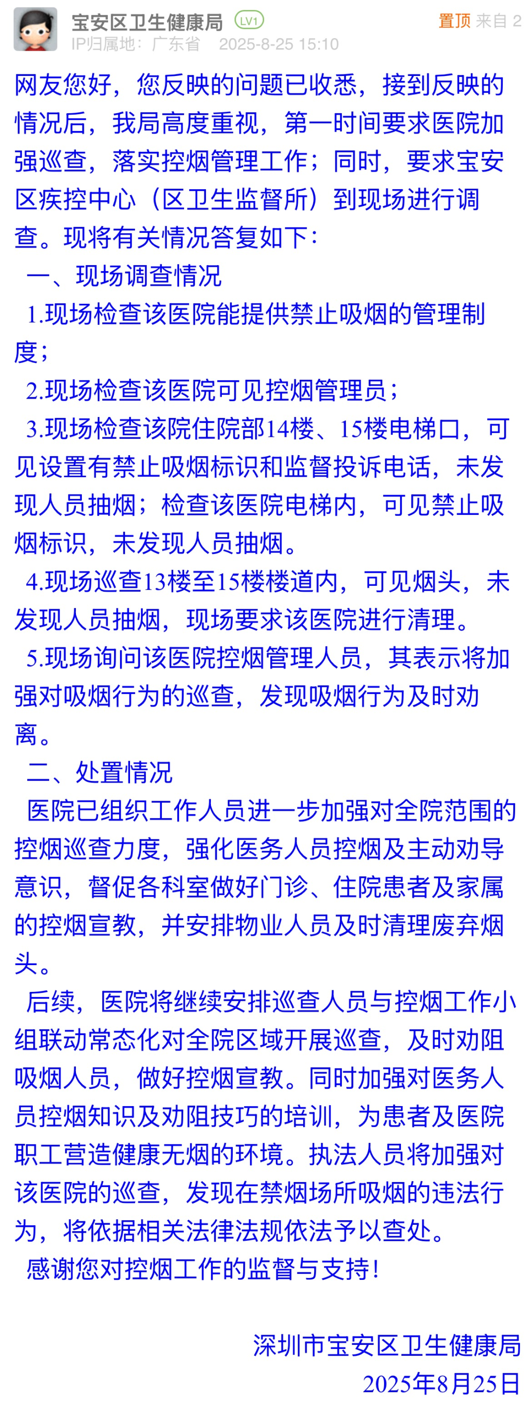 優(yōu)化建議:接到市民反饋后,寶安區(qū)衛(wèi)生健康局快速組織現(xiàn)場(chǎng)調(diào)查,核實(shí)醫(yī)院有禁煙制度、控?zé)煿芾韱T在崗,基礎(chǔ)控?zé)煷胧┖瞬榈轿?,值得點(diǎn)贊。但回應(yīng)中多次強(qiáng)調(diào)“未發(fā)現(xiàn)人員抽煙”,回避對(duì)歷史吸煙行為處置、煙頭來(lái)源及勸阻機(jī)制失效的解釋?zhuān)c市民關(guān)切脫節(jié),難以消除市民對(duì)醫(yī)院日???zé)熌芰Φ膿?dān)憂,建議完善具體控?zé)煷胧?,如加裝煙感報(bào)警裝置,建立核查公示制度等,筑牢“無(wú)煙醫(yī)院”防線。