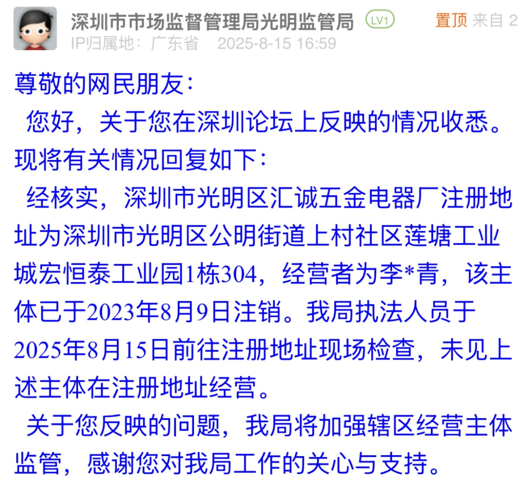 優(yōu)化建議:深圳市市場(chǎng)監(jiān)督管理局光明管理局的回應(yīng)中,核實(shí)了涉事電器廠已注銷(xiāo),且不在注冊(cè)地經(jīng)營(yíng),也提及加強(qiáng)轄區(qū)主體監(jiān)管,但市民反映的排插套用注銷(xiāo)主體信息銷(xiāo)售、違規(guī)標(biāo)識(shí)3C標(biāo)志等關(guān)鍵問(wèn)題,未得到明確解答。若回應(yīng)中能豐富指引類(lèi)內(nèi)容,如告知市民可向平臺(tái)追責(zé)的途徑、提交證據(jù)的具體方式,為市民維權(quán)提供清晰方向,將更貼合市民需求,也能讓回應(yīng)更具實(shí)際意義。